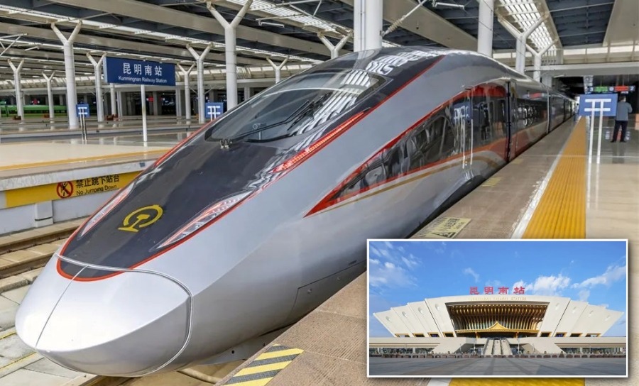 目前每天有兩對高鐵列車來往北京和昆明,二等票價全程要1,200多元人民幣。圖為停靠昆明南站的復興號高鐵列車,小圖為昆明南站外觀。(網上圖片)