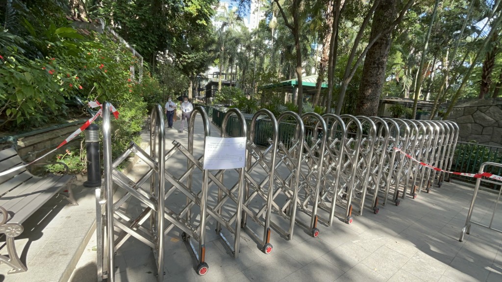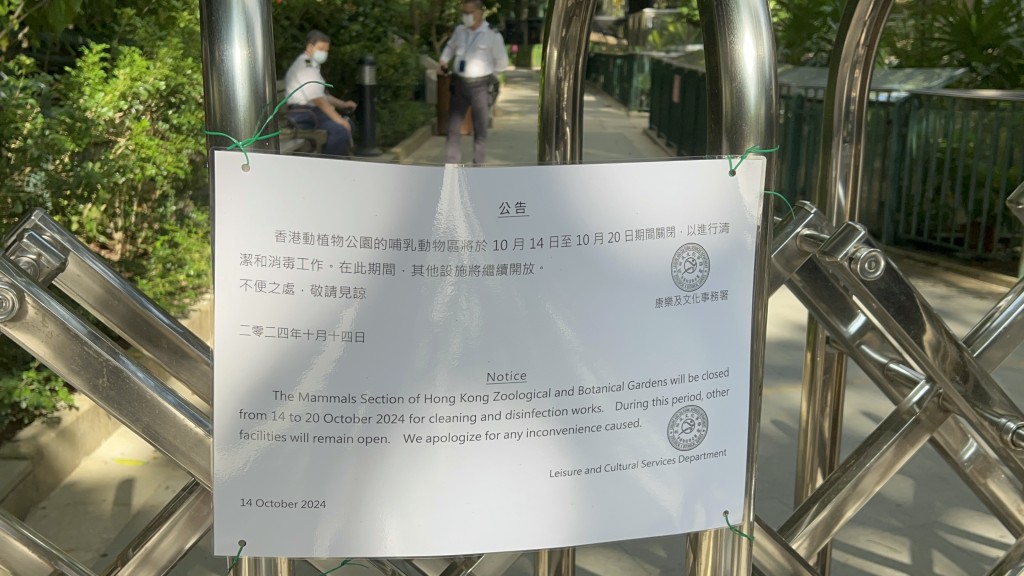 香港動植物公園哺乳類動物區外有鐵閘圍封,鐵閘綁上通告。通告原先指該區由今日起至10月20日起關閉,惟職員後來更換另一張,沒有指明關閉時間。