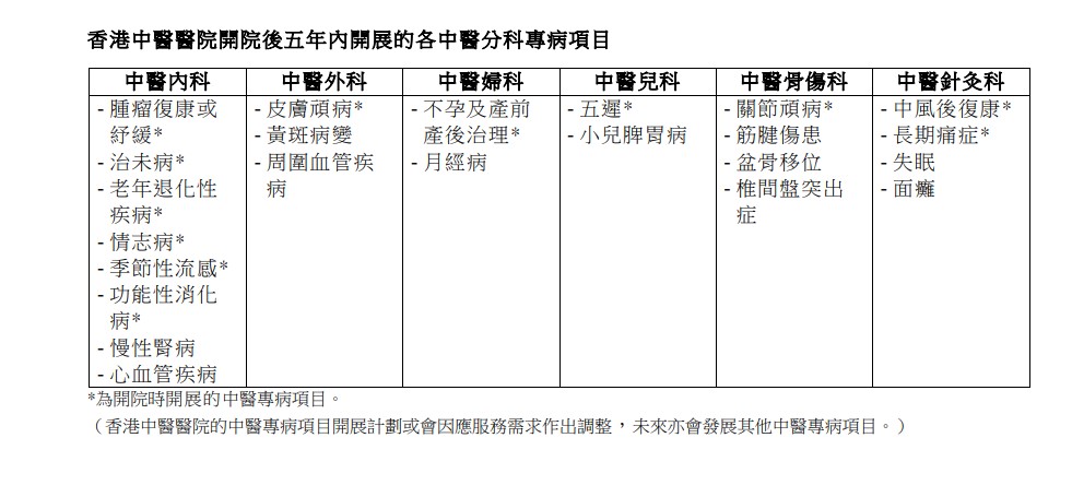 至於其餘11項專病項目,包括慢性腎病、心血管疾病、黃斑病變、周圍血管疾病、月經病、小兒脾胃病、筋腱傷患、盆骨移位、椎間盤突出症、失眠和面癱,局方表示,會循序漸進地在開院後5年內陸續開展。