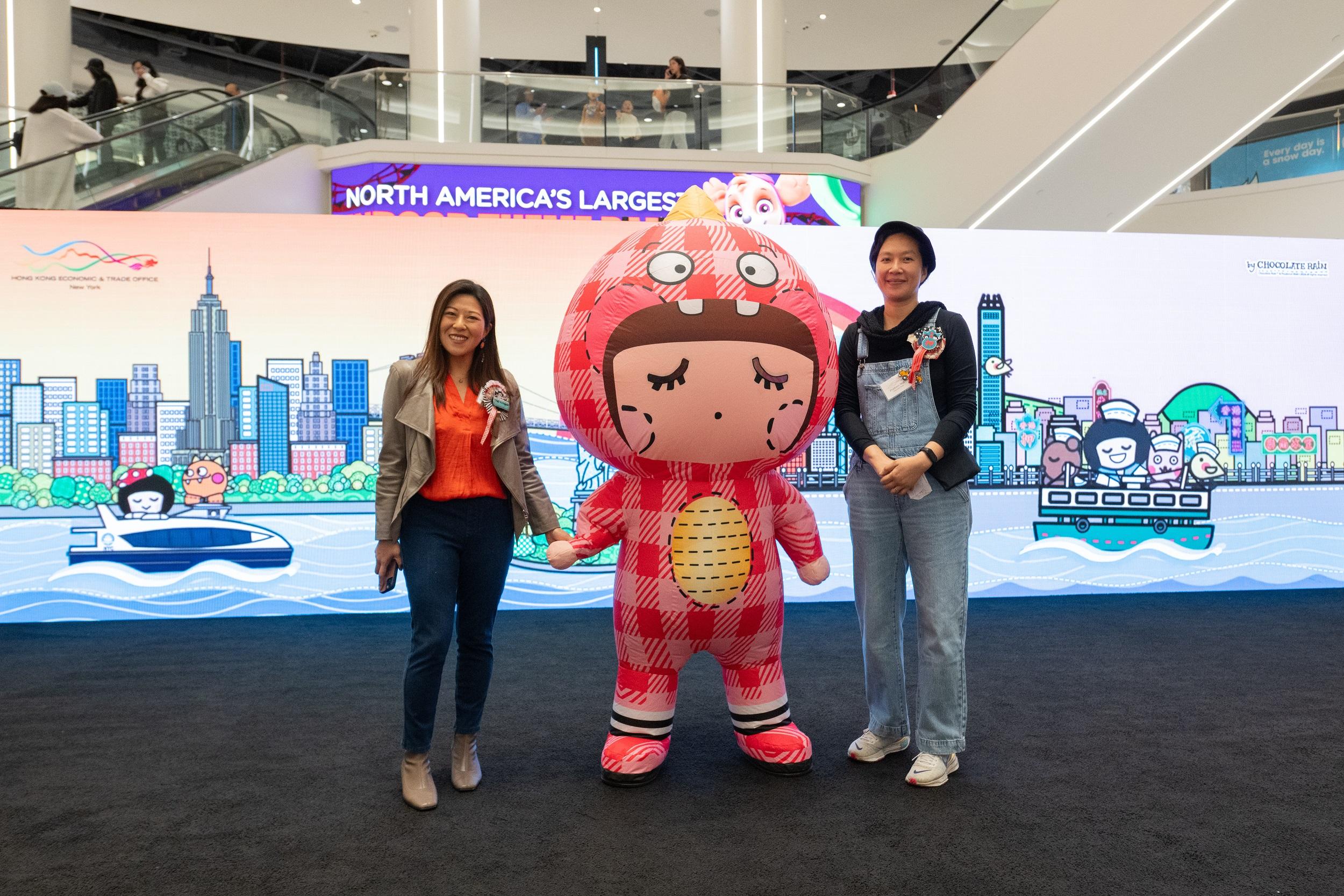 香港駐紐約經貿辦處長何美智(左)、香港創意品牌Chocolate Rain 創辦人麥雅端(右)及Chocolate Rain 吉祥物 Fatina (中)十月十二日(新澤西時間)出席藝術展開幕禮