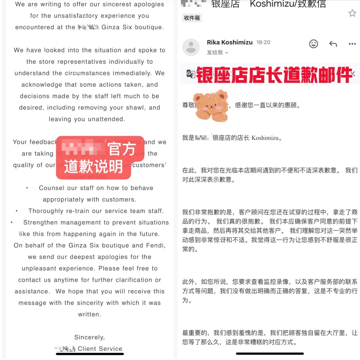 但這解釋反而令事主更生氣,她表示「根本沒徵得我同意」。她認為店內的緊急情況處理流程糟糕,並決定在網上公開此事,同時計劃向名店意大利總部投訴。第二天,她發現店經理撒謊稱店內沒有監控,實際上是有的。店員還告訴她沒有正規投訴渠道,這同樣是不實之言。因此,她決心「向品牌高層發送投訴郵件,直到得到滿意答復」。不久後,品牌日本官方和銀座店店長通過電子郵件向她道歉,並指「銀座店經理想要親自到酒店登門道歉。」