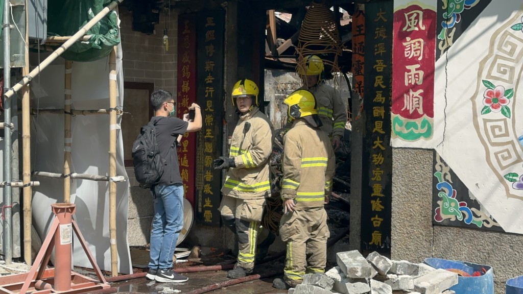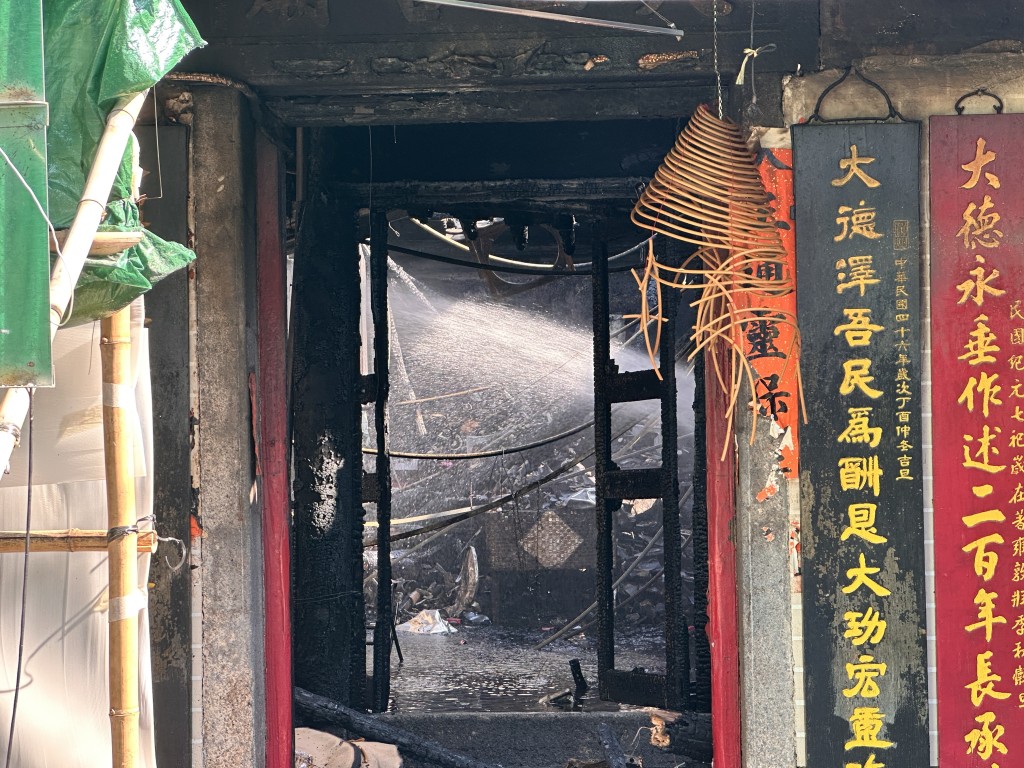 大王古廟昨晚發生火警,消防今早仍在現場射水,防死灰復燃。