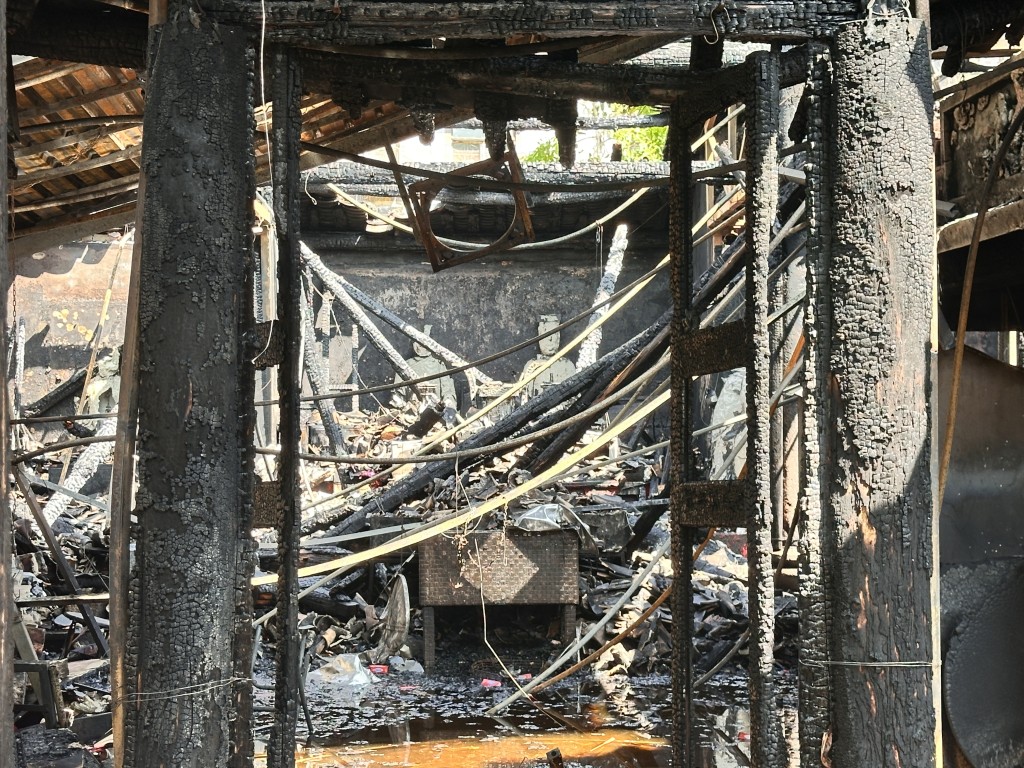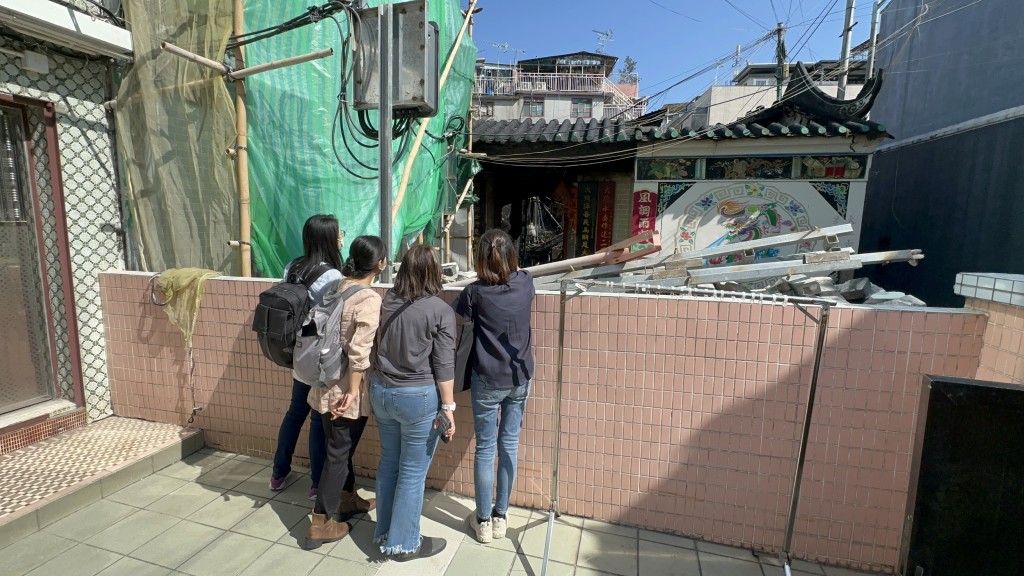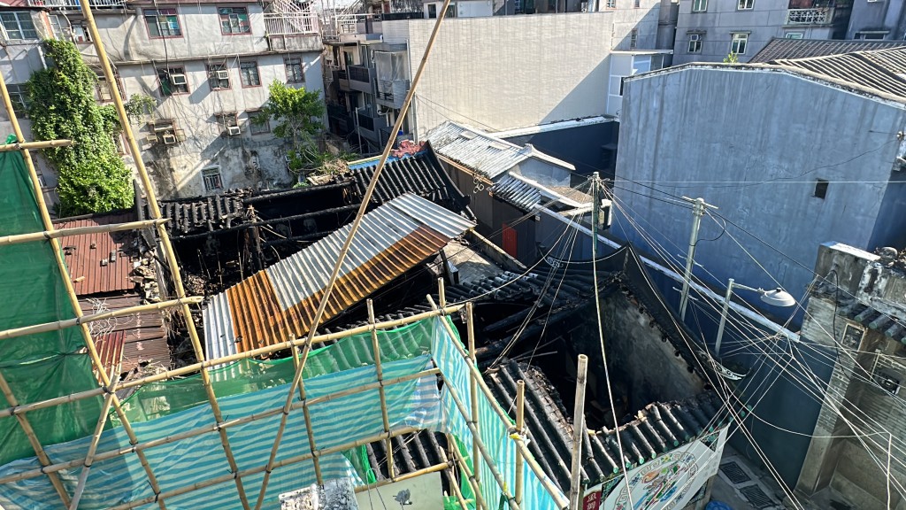 今早,大王古廟現場未解封,消防繼續在廟內射水降溫,以防死灰復燃。現場所見古廟被「燒通頂」,部分屋頂倒塌,屋頂及牆身更出現裂痕,恐再有倒塌危險。塌下的瓦頂散落一地,內部部分木製品盡毀,一片凌亂。