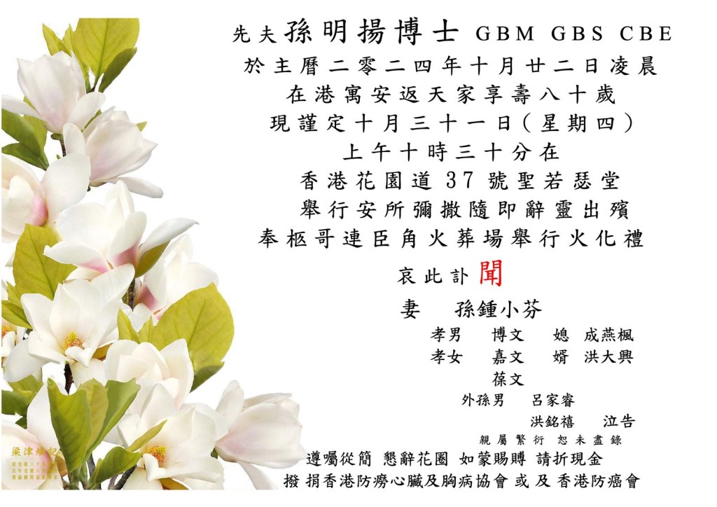 【橙訊】前教育局局長孫明揚周二(22日)凌晨離世,享年80歲。其家人已發訃聞,訂於下周四(31日)早上在花園道聖若瑟堂舉行安所彌撒,並隨即辭靈出殯,奉柩到哥連臣角火葬場舉行火化禮。