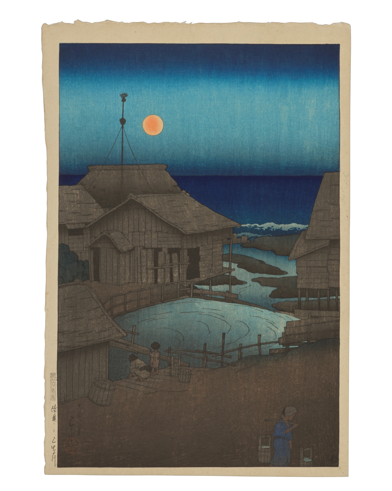 川瀨巴水是日本新版畫運動中的代表人物。他對旅遊出行充滿熱忱,因為旅行對他來說遠不止於玩樂,還是為了速寫。他十分挑剔作畫的位置,雖不時描繪著名景點,卻極少從熱門旅遊視角作畫。面對名刹,也會避開正面描繪,反而專注於毫不起眼的局部。他的作品中很少有人物的出現,有的話也是以側面或背面入畫,且多數置於畫緣,構成背景的一部分,為畫作添上一點煙火氣。
