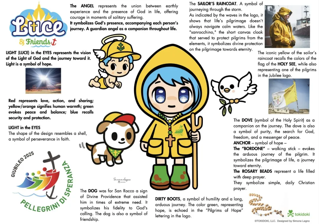 Luce擁有藍色頭髮和黃色雨衣,色彩靈感來自梵蒂岡國旗,象徵着「穿越人生的風暴」。她手持朝聖者手杖,象徵「永恆朝聖之路」,腳踏泥濘靴子,意味着「漫長艱辛的旅程」。她的眼睛呈扇貝形,代表天主教朝聖傳統,明亮的眼睛象徵內心希望。Luce還佩戴玫瑰念珠,設計師希望她能觸動年輕一代的心。