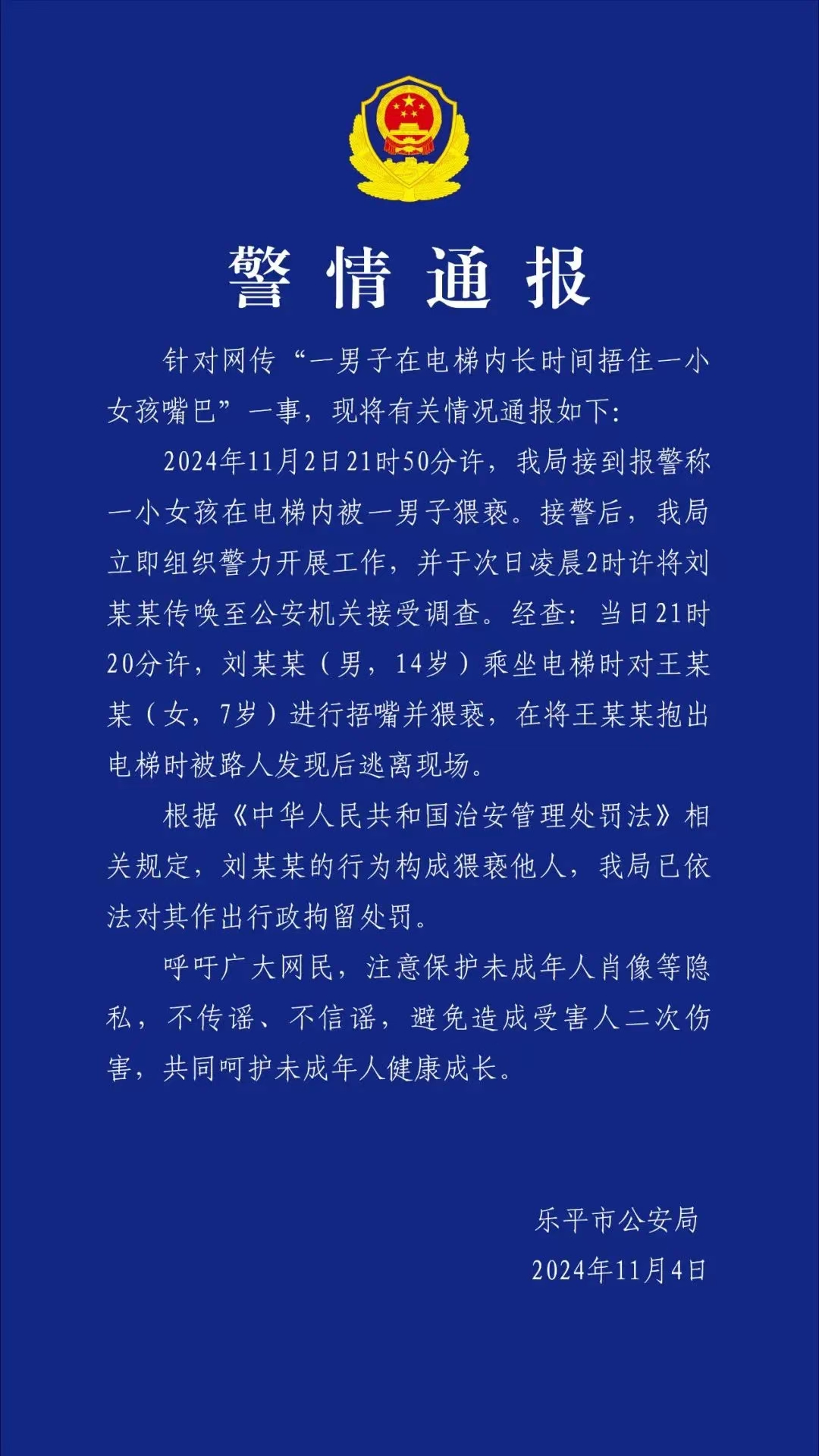 而據該網民提供的業主群聊記錄,女孩只有七歲,家屬稱報警後不滿24小時涉事男孩就被釋放,因為他14歲未成年,不承擔刑事責任。家屬認為肇事者很快被釋放,而他們沒有得到應有的回應,每次看到涉事監控都感到極度恐懼。