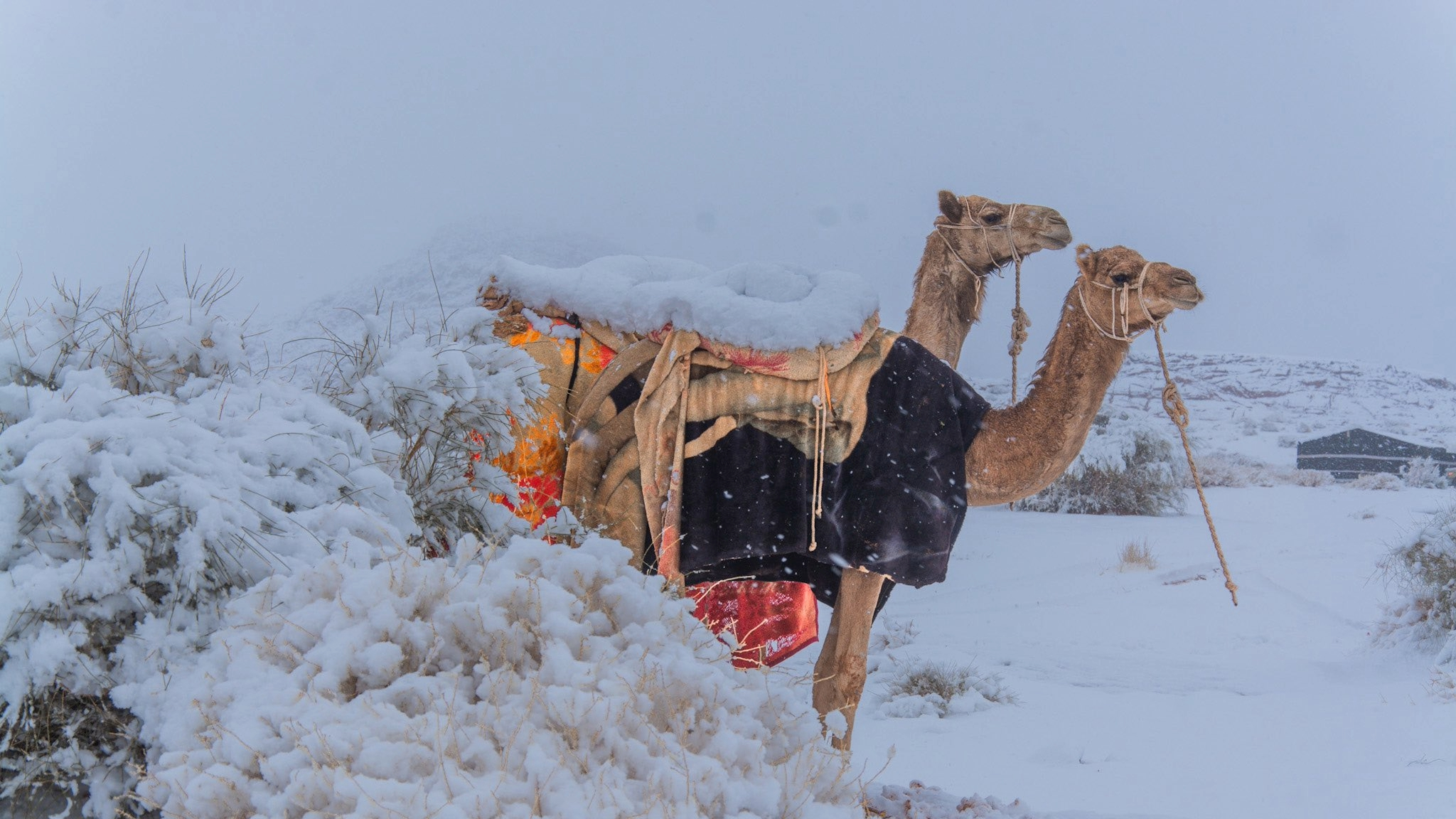 根據社群平台流傳的影片和畫面,白雪覆蓋了一大片的沙漠,駱駝置身其中看起來十分奇特且夢幻。