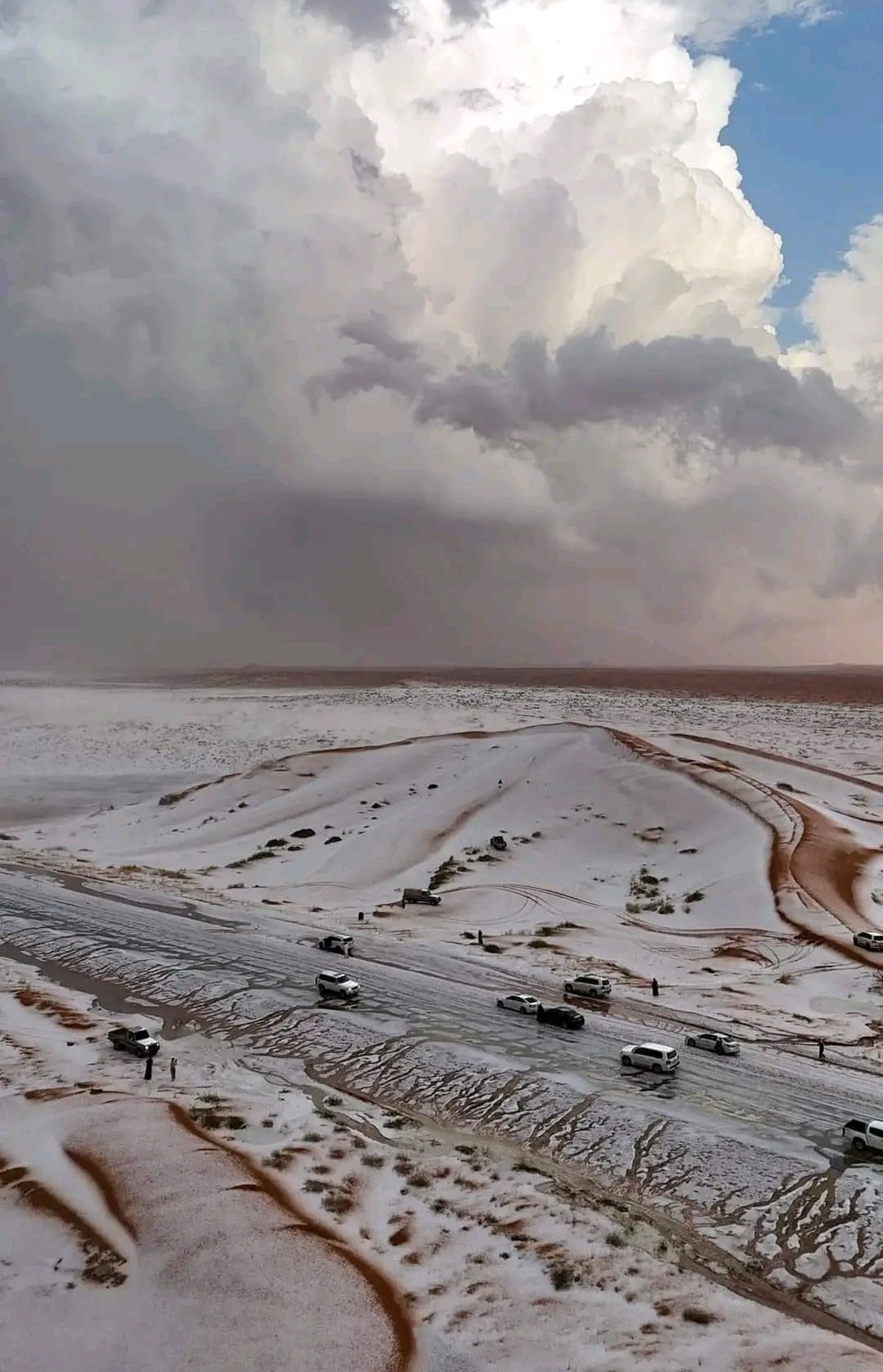 位於中東的沙特阿拉伯,長年炎熱,屬於天氣極度乾旱的沙漠地區。不過,沙特阿拉伯西北部的焦夫省在上週罕有降雪與落冰雹,讓原本黃沙滾滾的荒蕪沙漠,披上一層銀白色的銀裳,吸引許多當地民眾出門賞雪。