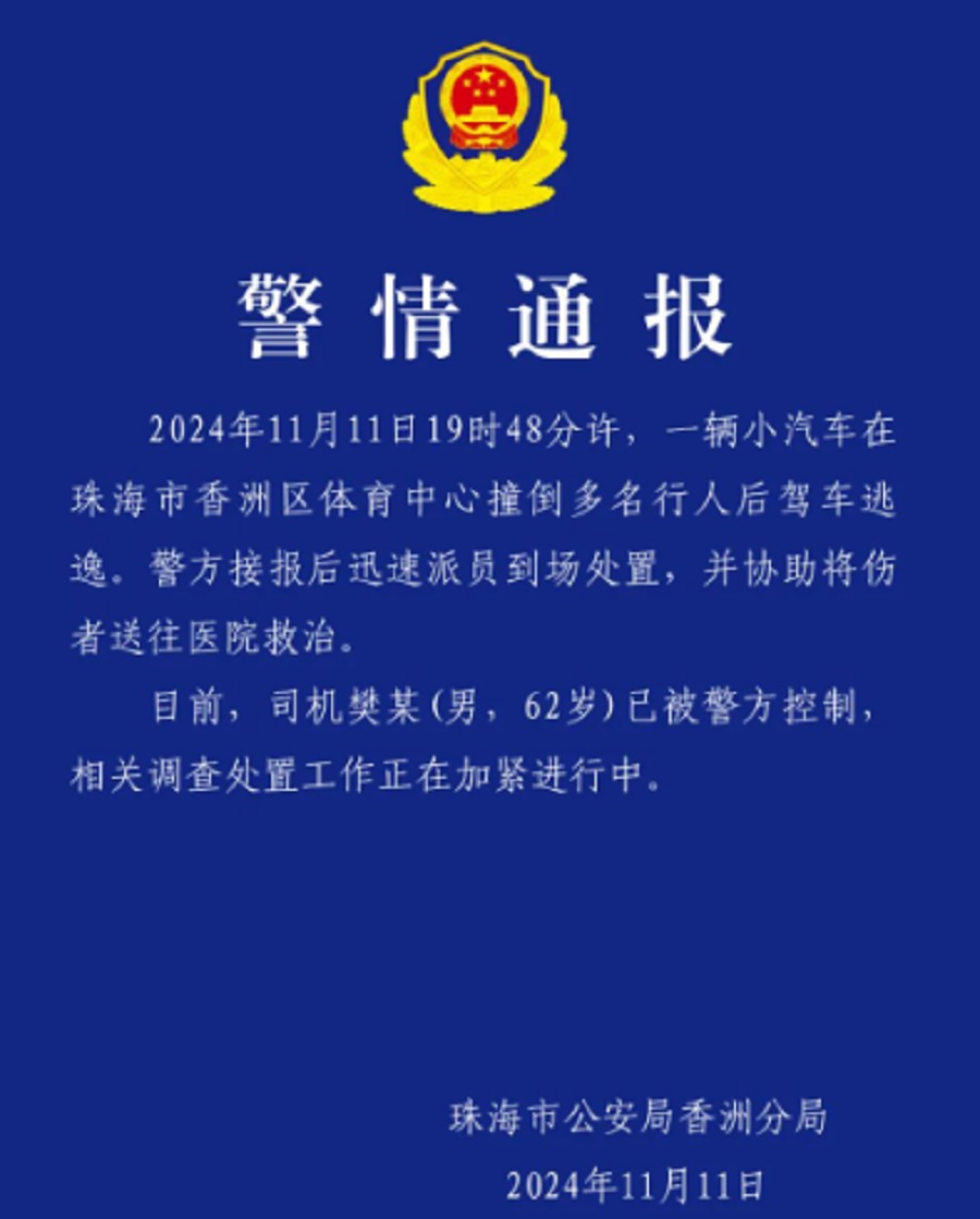 珠海市公安局香洲分局事後通報,事發於11月11日晚上7時48分許,一輛小汽車在珠海市香洲區體育中心撞倒多名行人後駕車逃逸。警方接報後派員到場處置,並協助將傷者送往醫院救治。目前,62歲樊姓男司機已被控制,相關調查處置工作正在進行中。