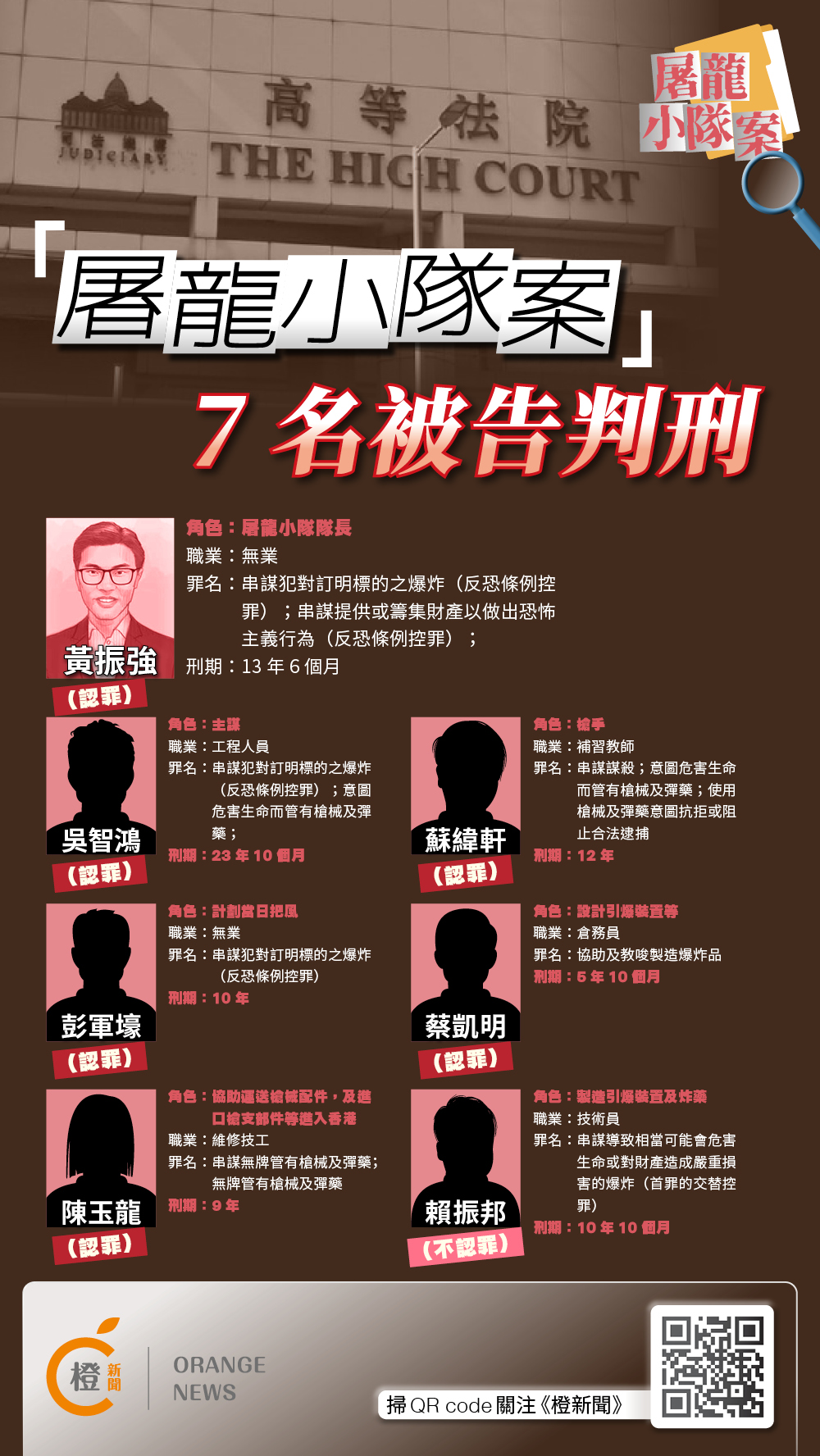 【橙訊】「屠龍小隊」隊長黃振強及吳智鴻團夥涉串謀在2019年12月8日遊行中設置炸彈襲警案,「屠龍小隊」隊長黃振強、吳智鴻等6名認罪被告,以及經審訊後被陪審團裁定串謀導致爆炸罪成的賴振邦,今日(14日)在高等法院判刑。「屠龍小隊」隊長黃振強被判入獄13年6個月;吳智鴻判囚23年10個月;炸彈運送者彭軍壕被判入獄10年;蘇緯軒判囚12年;蔡凱明判囚5年10個月;陳玉龍判囚9年。賴振邦判囚10年10個月。