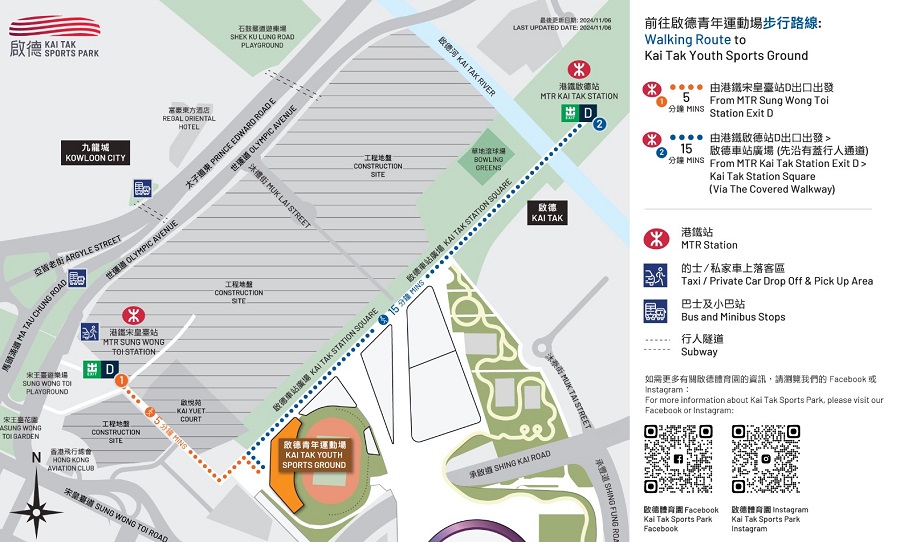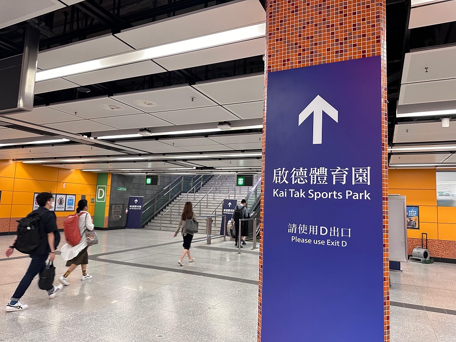 港鐵指,星期六的測試活動將於園區的青年運動場舉行,前往場館的乘客可乘搭港鐵至宋皇臺站,沿D出入口步行約5至10分鐘前往。港鐵已在鄰近園區的宋皇臺站及啟德站設置相關指示牌及標示,包括在車站大堂增設顯眼的大型牆身貼紙和在天花位置安裝標示,引導乘客使用 D 出入口往返園區。