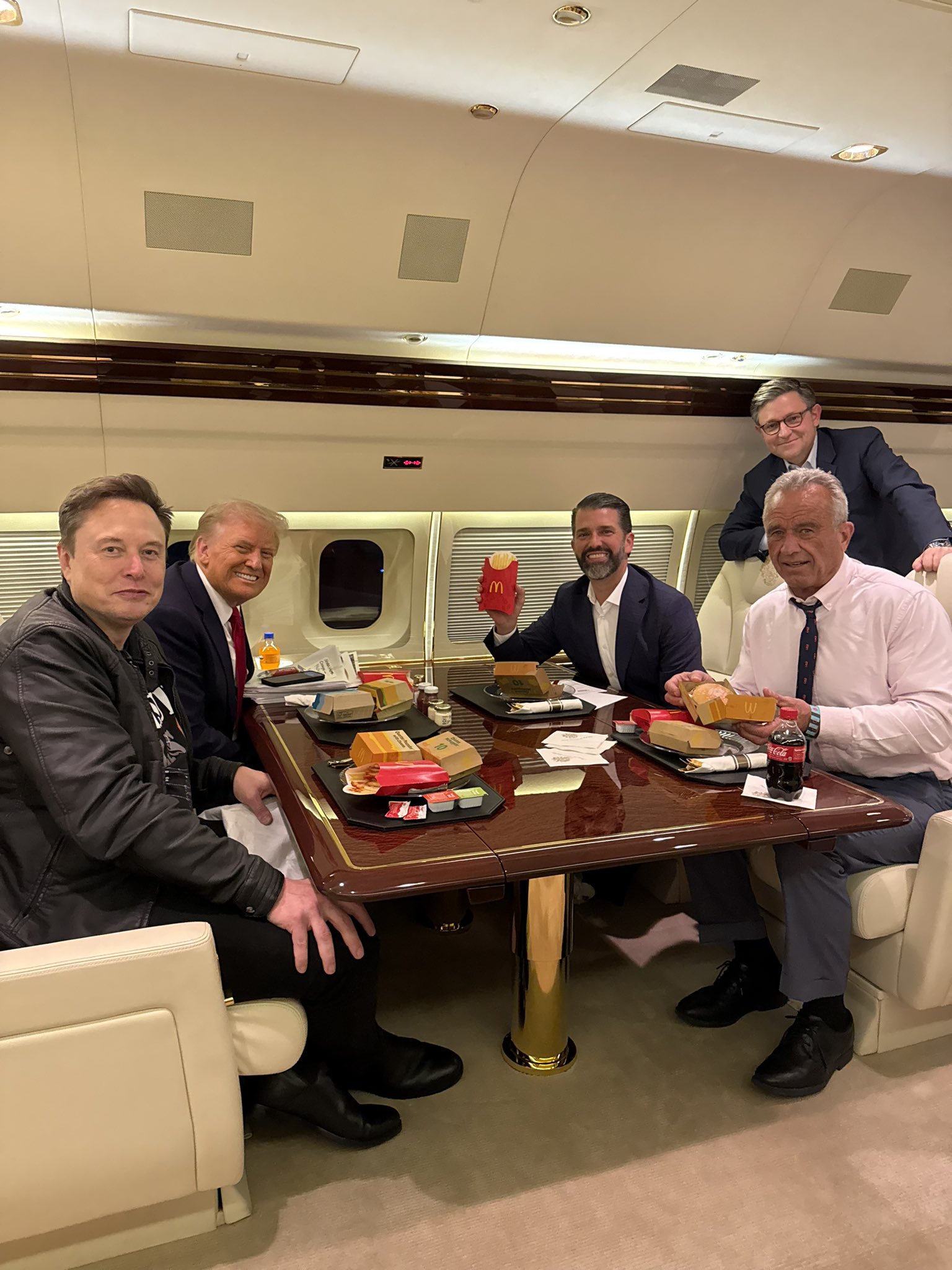 據外媒報道,小羅拔甘迺迪於周六與特朗普一起乘坐飛機前往紐約參加終極格鬥冠軍賽,同行的還有馬斯克和小唐納德。小唐納德周日在網上發布了一張照片,照片中幾個人坐在麥當勞食品托盤前,他還開玩笑地配文:「讓美國再次健康從明天開始」。有網民指,肯尼迪似乎是食客中最不熱情的,他小心翼翼地拿着一個打開的漢堡盒,面前放着薯條和一瓶可口可樂。