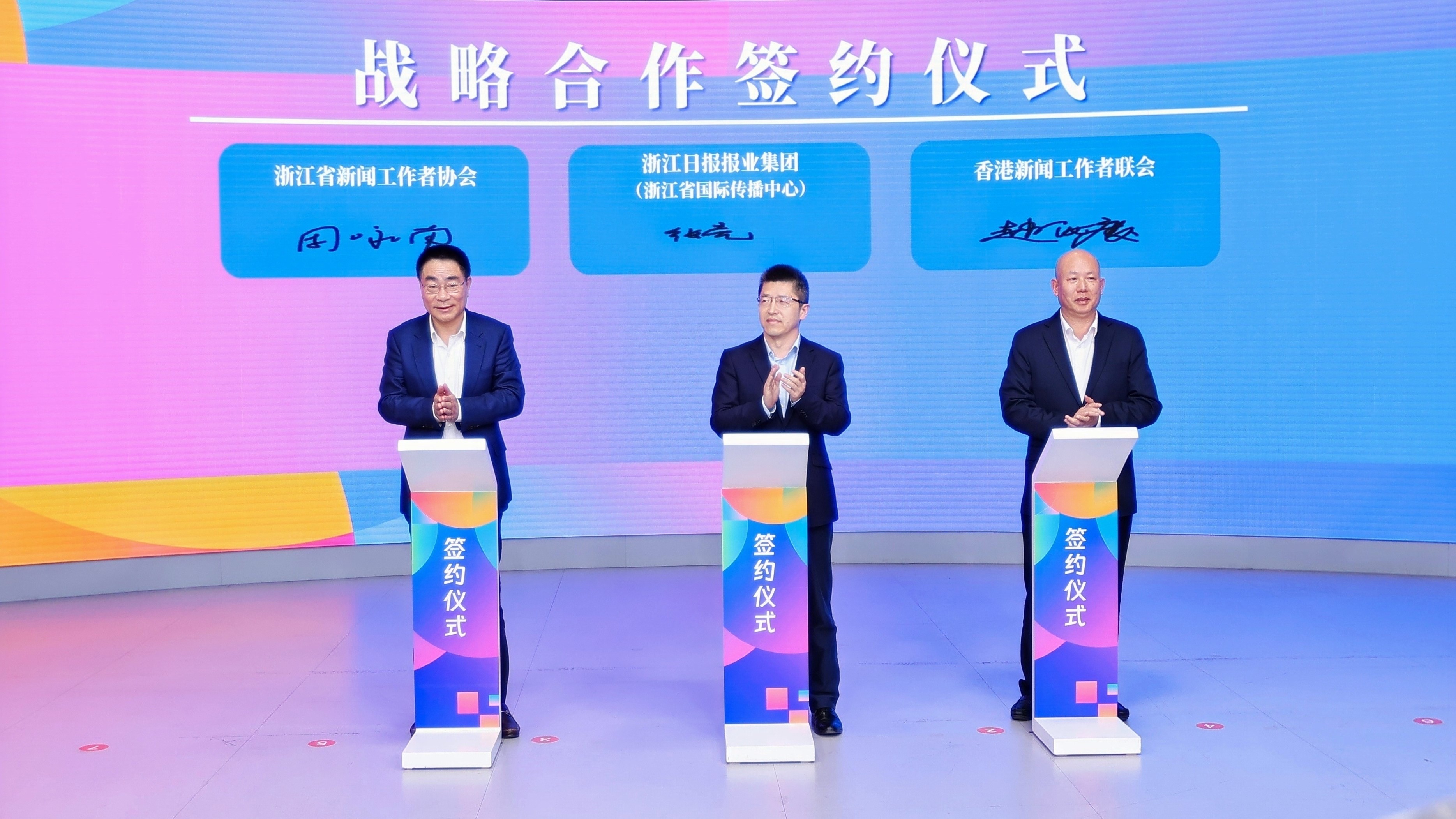 浙江省新聞工作者協會副主席周詠南(左)、浙江日報報業集團副總編輯、黨委委員張亮(中)、香港新聞工作者聯會秘書長趙汝慶(右)
