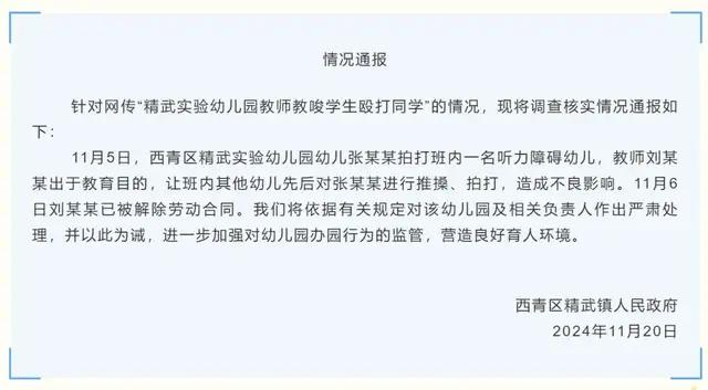 據此前報道,家長發布影片稱,幼兒園老師指導全班學生依次打自家孩子。影片中可見,教師發出指示後,孩子們依次上前掌摑一男童。對此,幼兒園工作人員確認了事件的真實性,並表示在事發次日已將涉事教師解僱。園方還提出願意為孩子提供心理輔導、賠償,並免除所有學費。