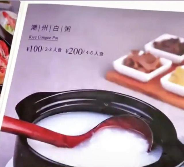 該飯店菜單顯示白粥價格為100-200人民幣。