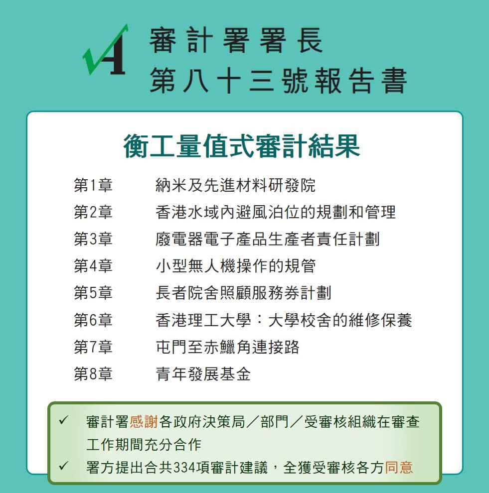 據介紹,《審計署署長第八十三號報告書》包括八個章節:1,納米及先進材料研發院;2,香港水域內避風泊位的規劃和管理;3,廢電器電子產品生產者責任計劃;4,小型無人機操作的規管;5,長者院舍照顧服務券計劃;6,香港理工大學:大學校舍的維修保養;7,屯門至赤鱲角連接路;8,青年發展基金。
