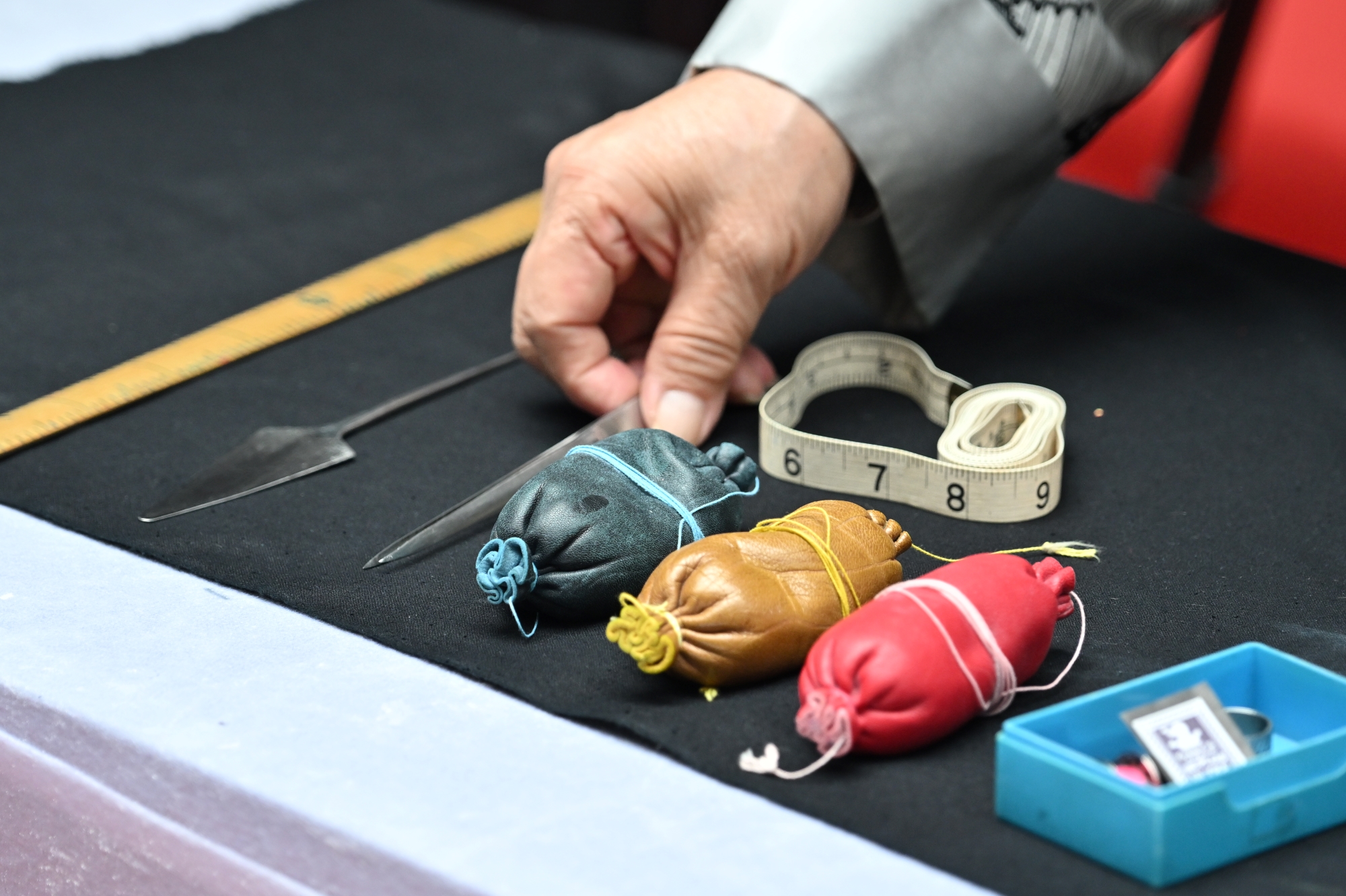 封師傅介紹,製作長衫的用具不多,主要就是剪刀、尺子、粉袋、鉗子、漿糊刀,還有頂針等各種針,製作工序其實也並不複雜,真正考驗的是對衣料的認知和裁剪的手藝。活動現場,封師傅展示了男、女裝長衫量身、製作緄條、挑縫紐條、製作盤扣扭頭的技藝。
