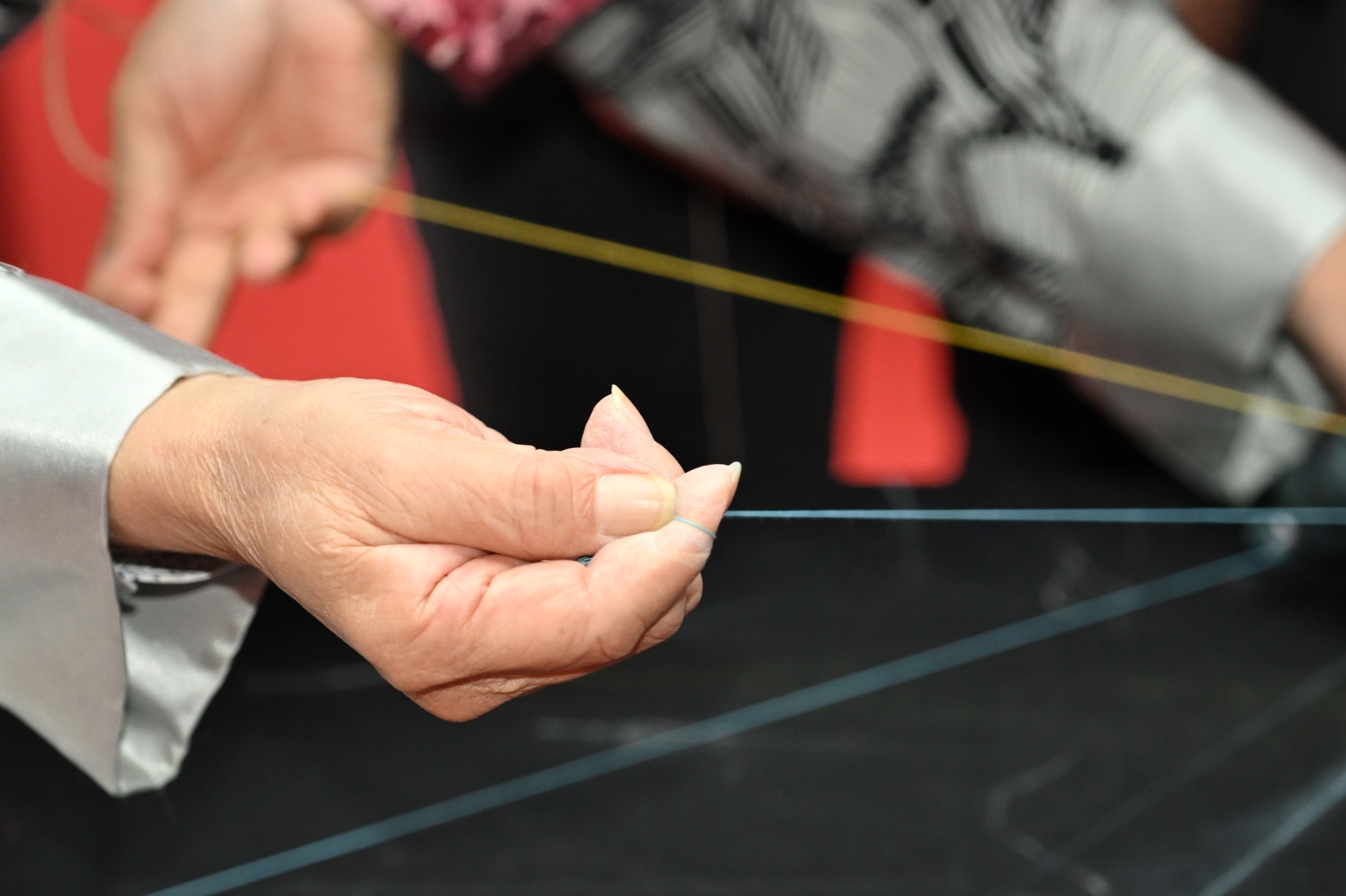 緄條和盤扣扭頭均是長衫的重要組成部分。長衫的「領、襟、袖、裾」等細節均可應用「緄、鑲、嵌、檔」等裝飾工藝。封師傅現場展示的扭條為一字直紐,並邀觀眾體驗製作盤扣扭頭,大家紛紛感歎手工藝的養成確實需要日積月累的練習,僅僅一個小紐扣的製作都充滿細節。