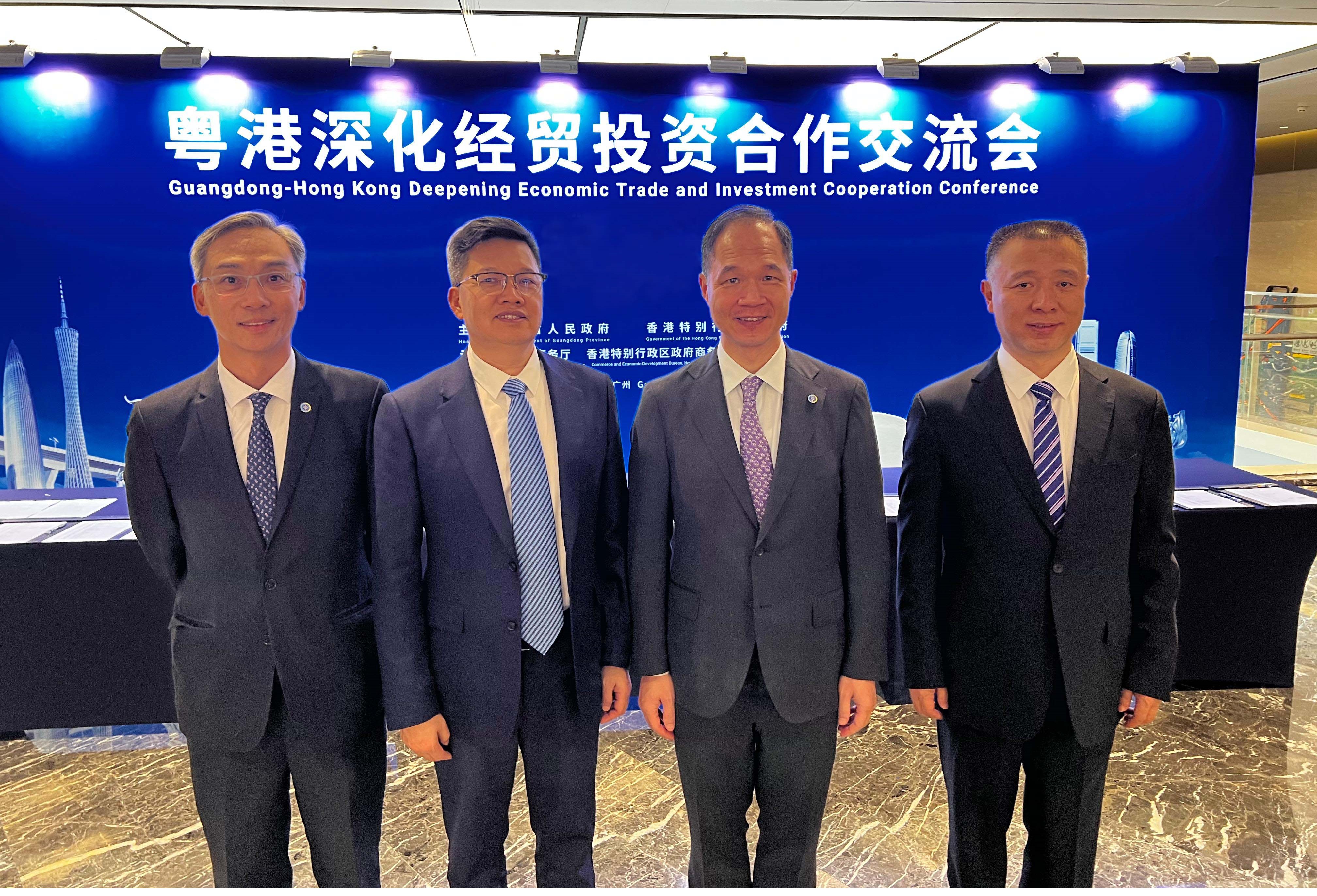 (左起)中電源動總裁吳永豪、特來電董事長于德翔、中電首席執行官蔣東強與中海石油氣電集團綠色航運專案組副總經理劉超出席粵港深化經貿投資合作交流會。