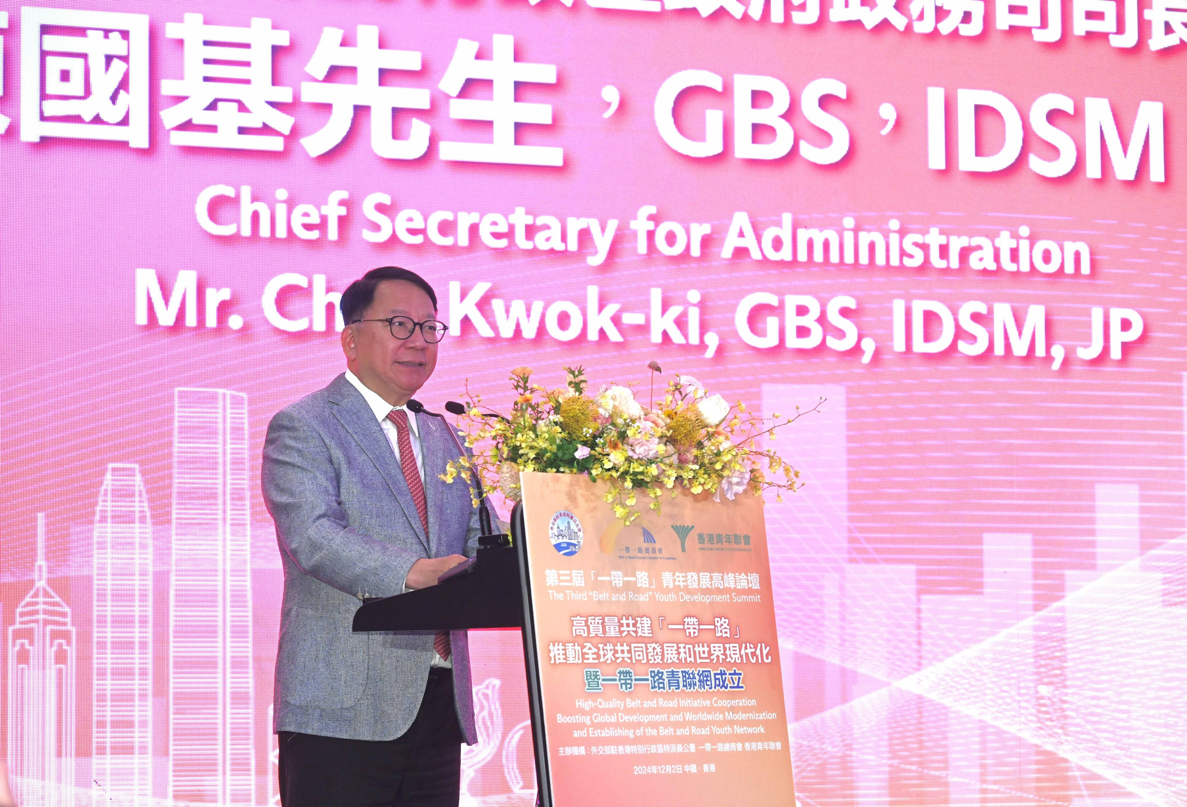 【橙訊】政務司司長陳國基今日(2日)出席第三屆「一帶一路」青年發展高峰論壇開幕式並且發表致辭。陳國基說,隨着「一帶一路」倡議進入下一個金色十年,香港會繼續擔當好「一帶一路」功能平台的角色,致力發揮「超級聯繫人」和「超級增值人」的作用。