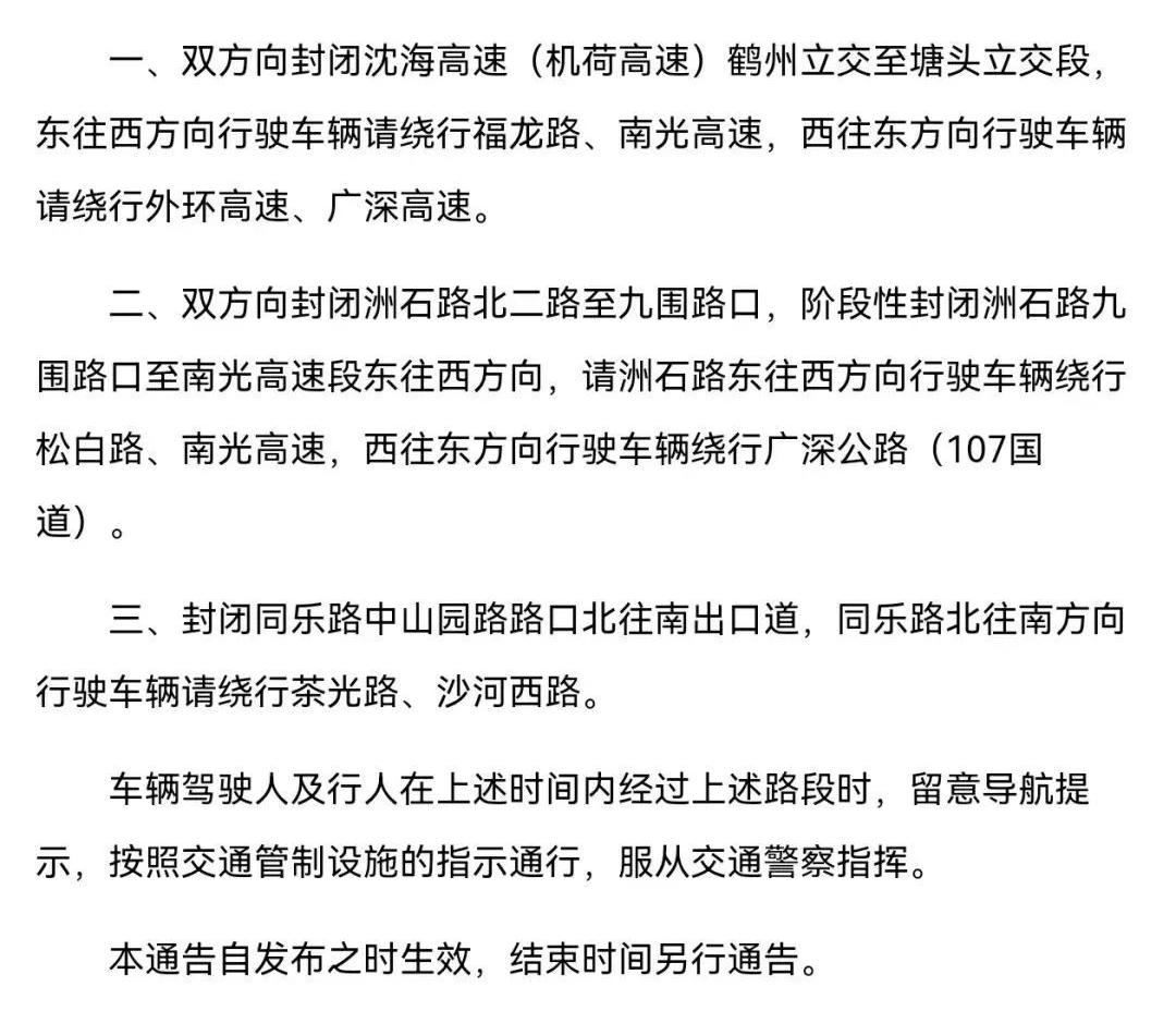 同時,深圳市公安局交通警察局發布「臨時封閉道路」通告稱,在搶險期間臨時對相關路段實施交通管制。具體路段如下: