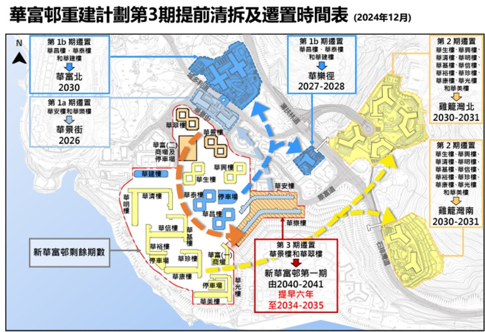 這個新安排預計可讓華翠樓和華景樓的租戶於2034年第2季遷入新華富邨第1期的新建接收大廈,較原有安排提早約6年。華翠樓和華景樓的目標清空日期相應由原定的2040/41年度,提前6年至2034/35年度。房委會會繼續為新華富邨剩餘期數的發展計劃與各政府部門緊密協調。