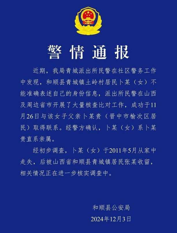 11月25日,山西晉中市和順縣一名女性向尋親志願者尋求幫助,希望協助她嬸嬸尋找親人。在志願者和警方的協助下,她的嬸嬸成功找到了家人,並確認了其嬸嬸正是卜女士。現在,卜女士已育有一子一女。
