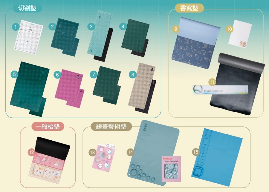 15款桌墊樣本,包括8款切割墊、3款書寫墊、3款繪畫藝術墊及1款一般枱墊,售價介乎每張10至198元。