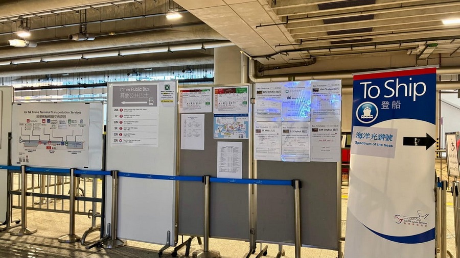 【橙訊】郵輪公司「皇家加勒比國際遊輪」本月起以香港作為季節性母港,其中「海洋光譜號」將會提供5個從香港出發的航次,預計未來兩個月帶來超過2萬名海外遊客。「海洋光譜號」今日接載約5000人再次到港,抵達啟德郵輪碼頭。早上約7時,陸續有的士、小巴及巴士駛入碼頭外的車站等候,車站亦增設交通資訊及路線圖,指導旅客乘車。