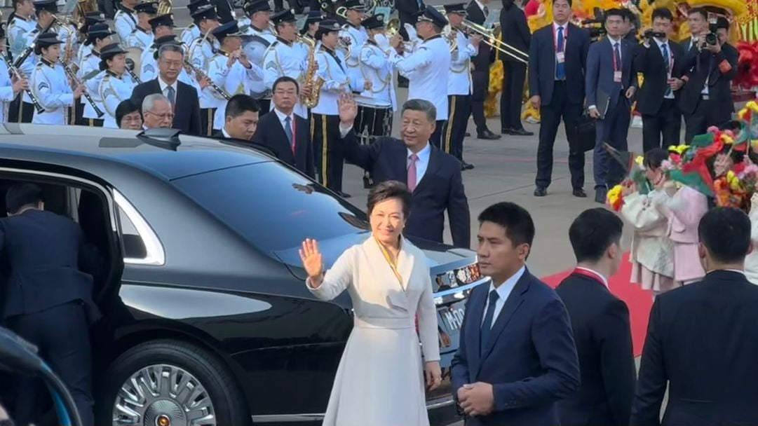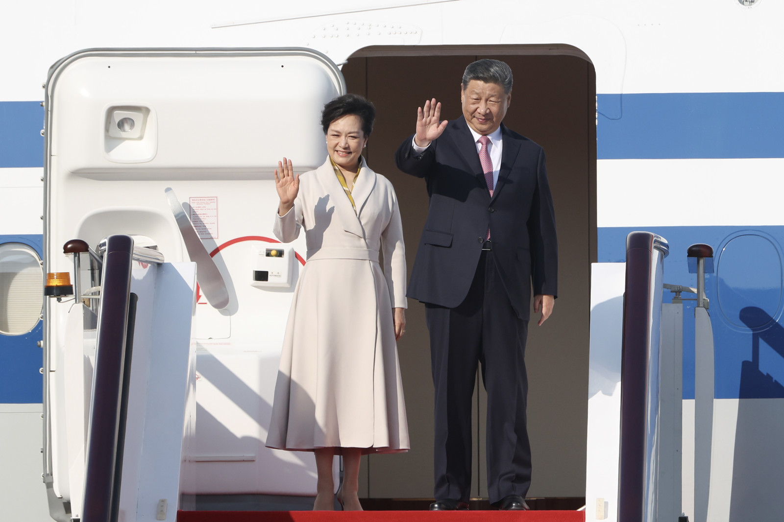 習近平與夫人彭麗媛抵達機場,向在場歡送人士揮手。
