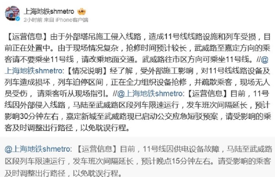 上海地鐵指,事件是由於外部塔吊施工侵入線路所致。
