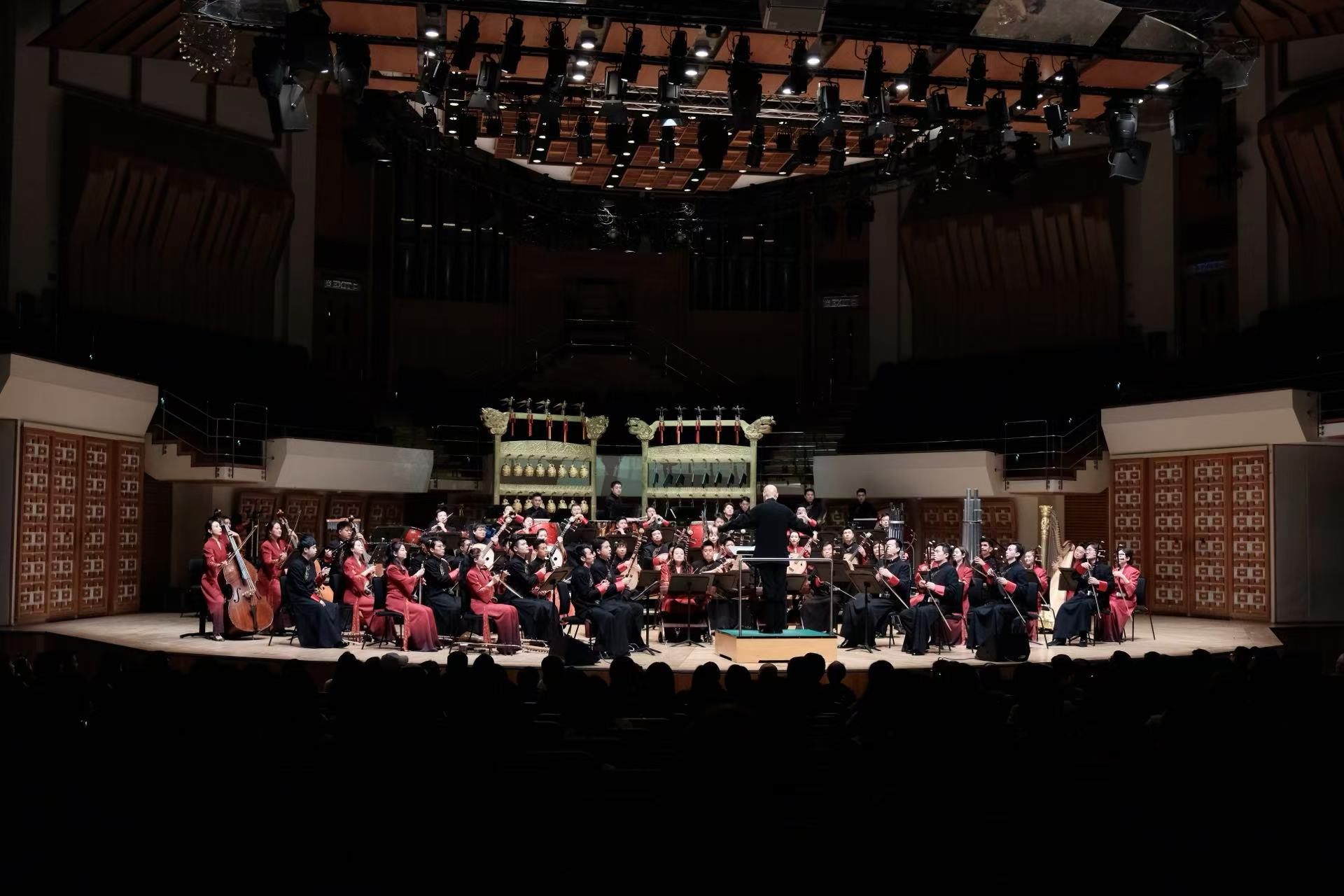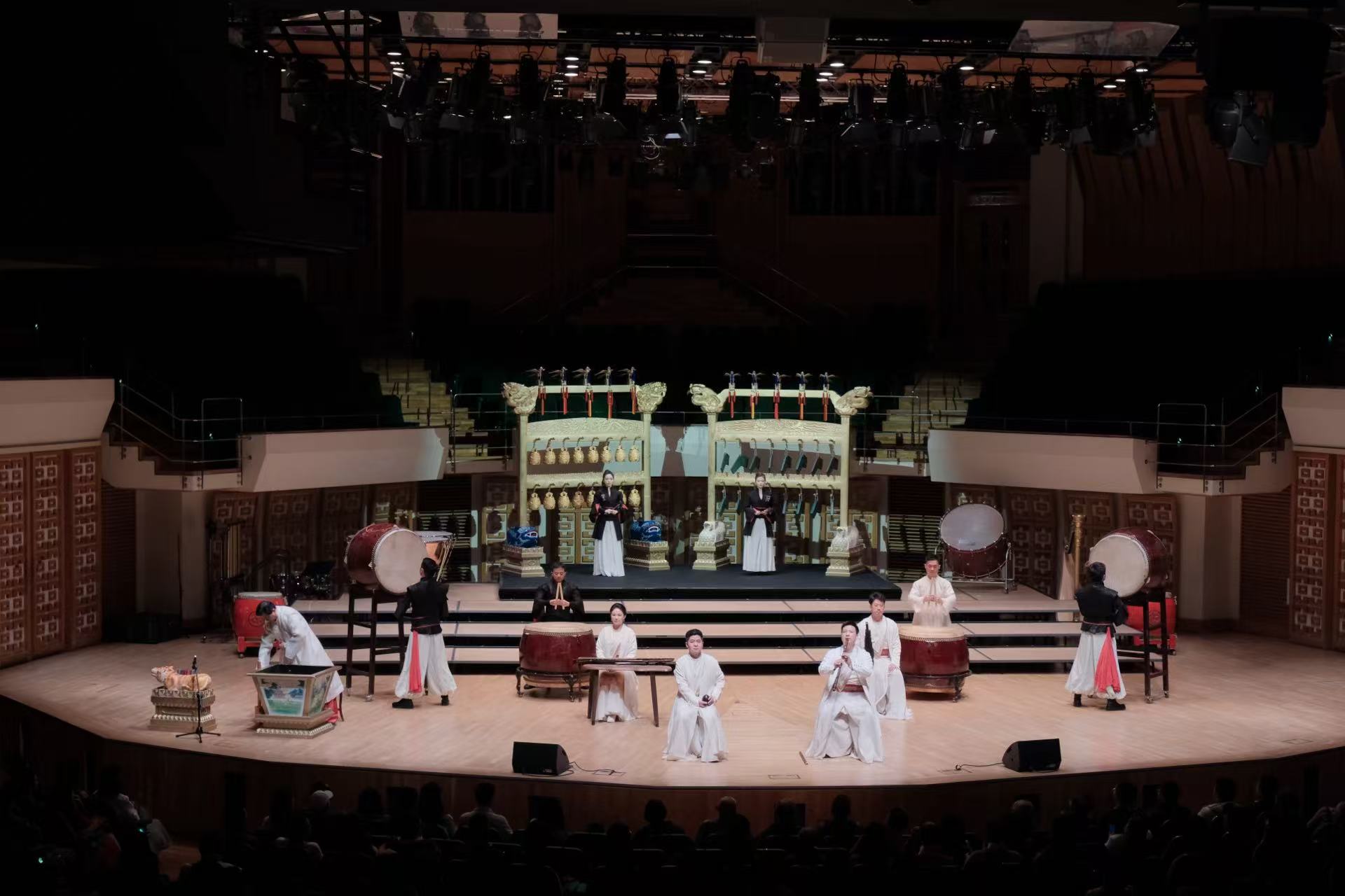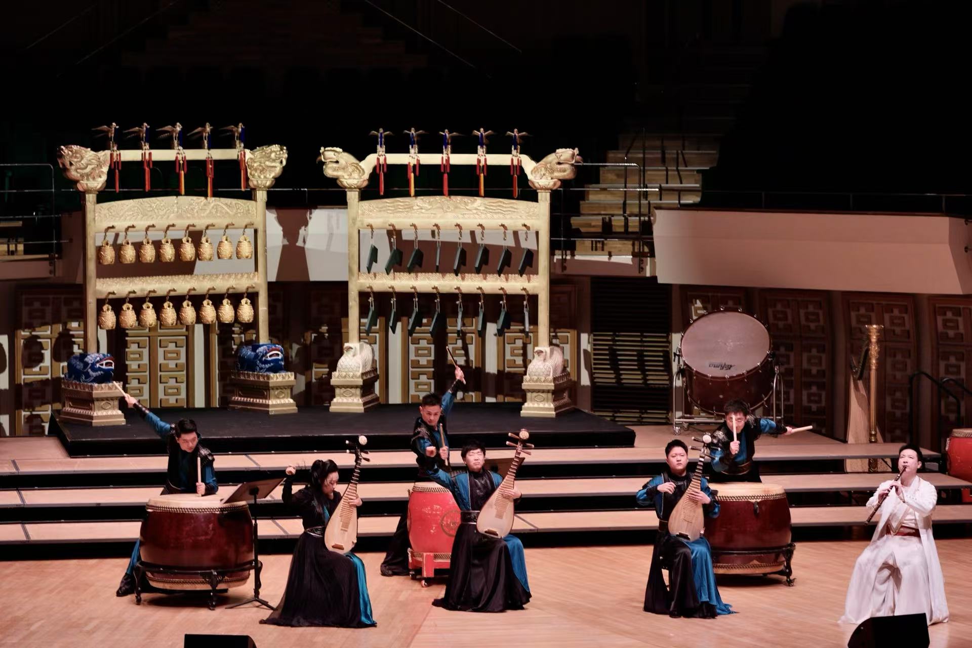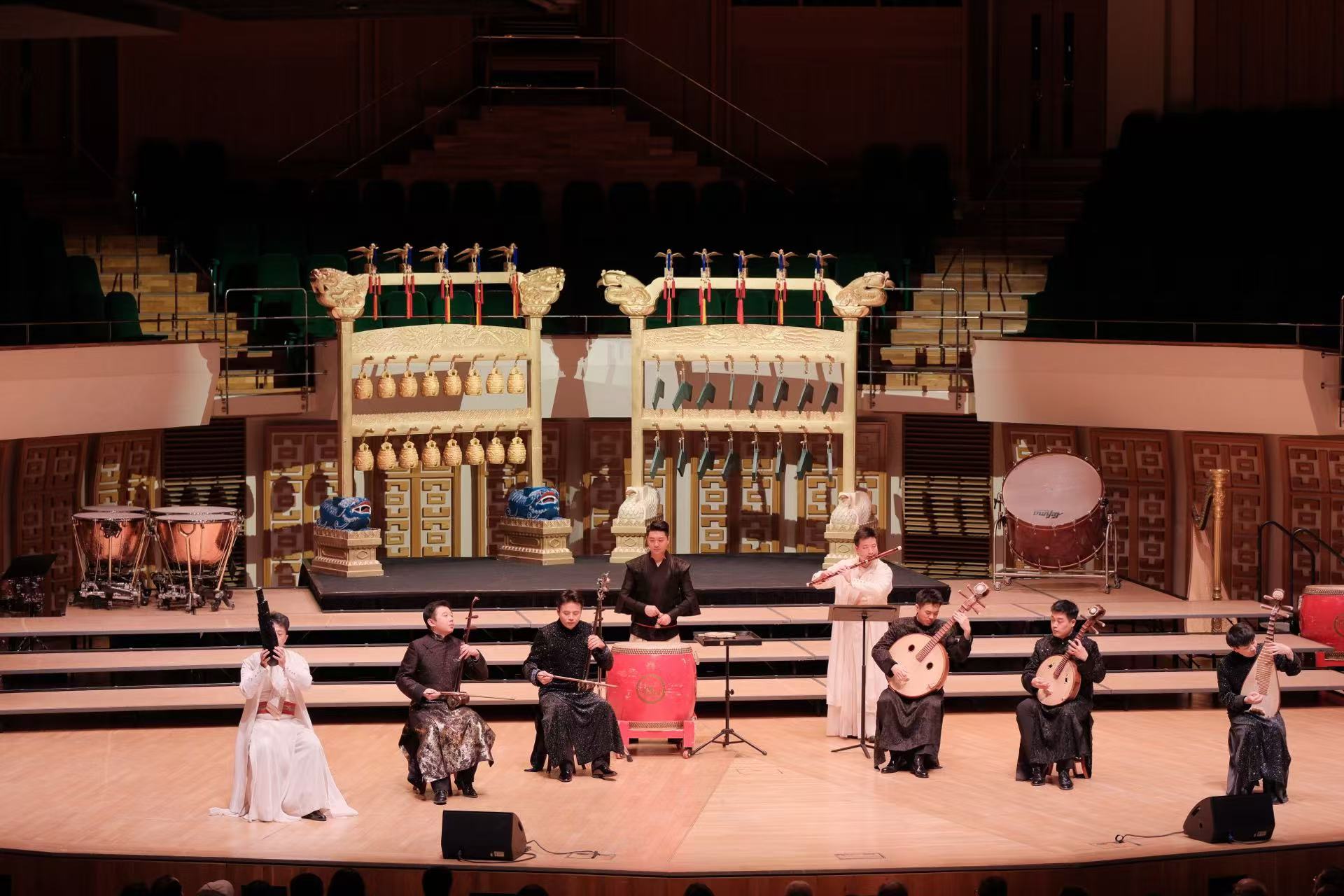 音樂會以凸顯儀式感的黃鐘.器樂合奏《頌》開篇,八音在演奏家的手中不僅再次發出源自古老華夏的悠然之音,也奏響當代中國的恢巨集之樂。青年古琴演奏家路寧緩緩撫琴,演奏帶着厚重歷史感的《知音》一曲,盡展古老樂器古琴的獨特魅力。琵琶三重奏《金戈鐵馬》由極具中國音樂代表性的經典曲目《十面埋伏》、《霸王卸甲》改編而成,打擊樂與琵琶的聲音交織,讓觀眾彷彿置身於激烈的戰鬥之中。大阮與吟誦《酒狂》據古曲改編,青年阮演奏家朱承梓化身瀟灑的古人,為觀眾帶來穿越時空的震撼。