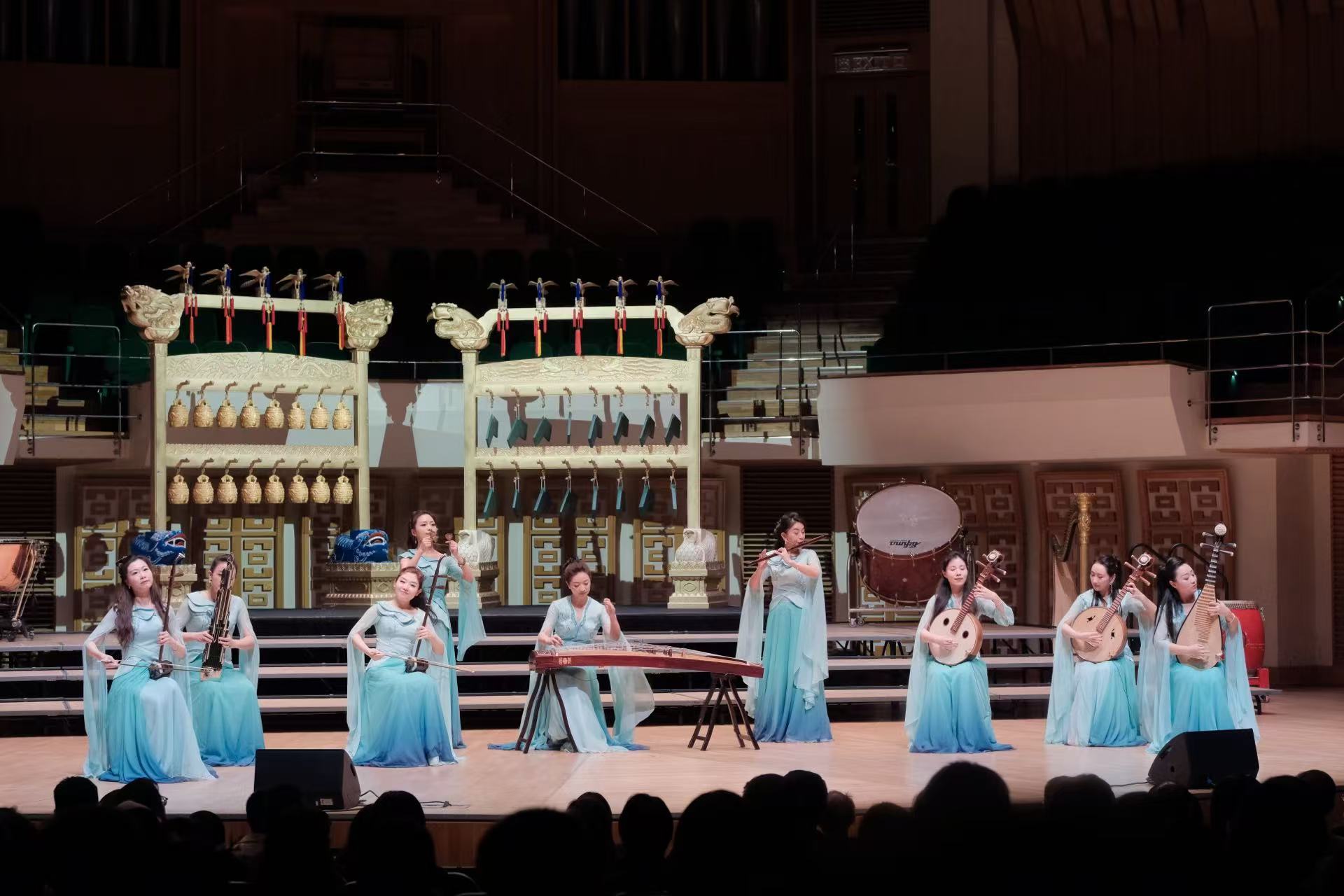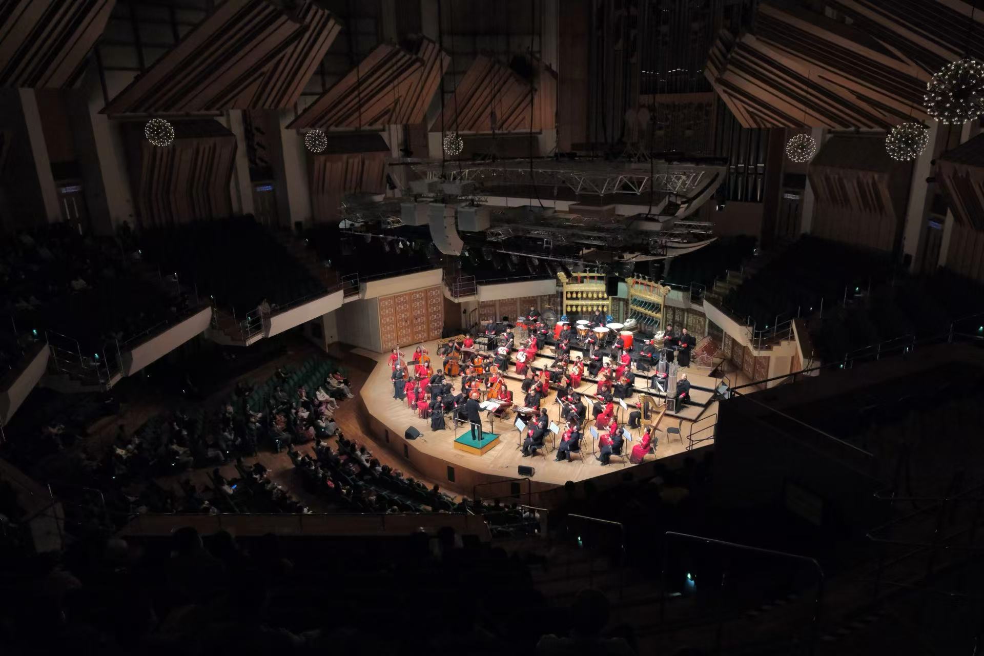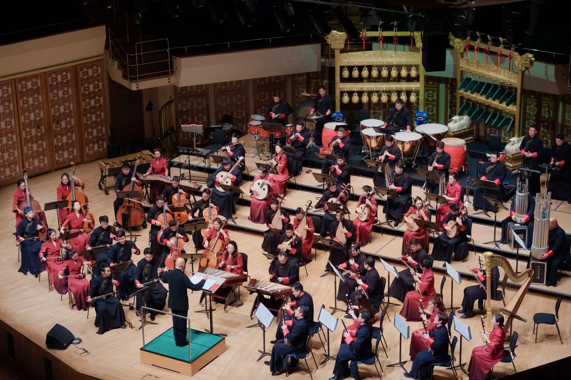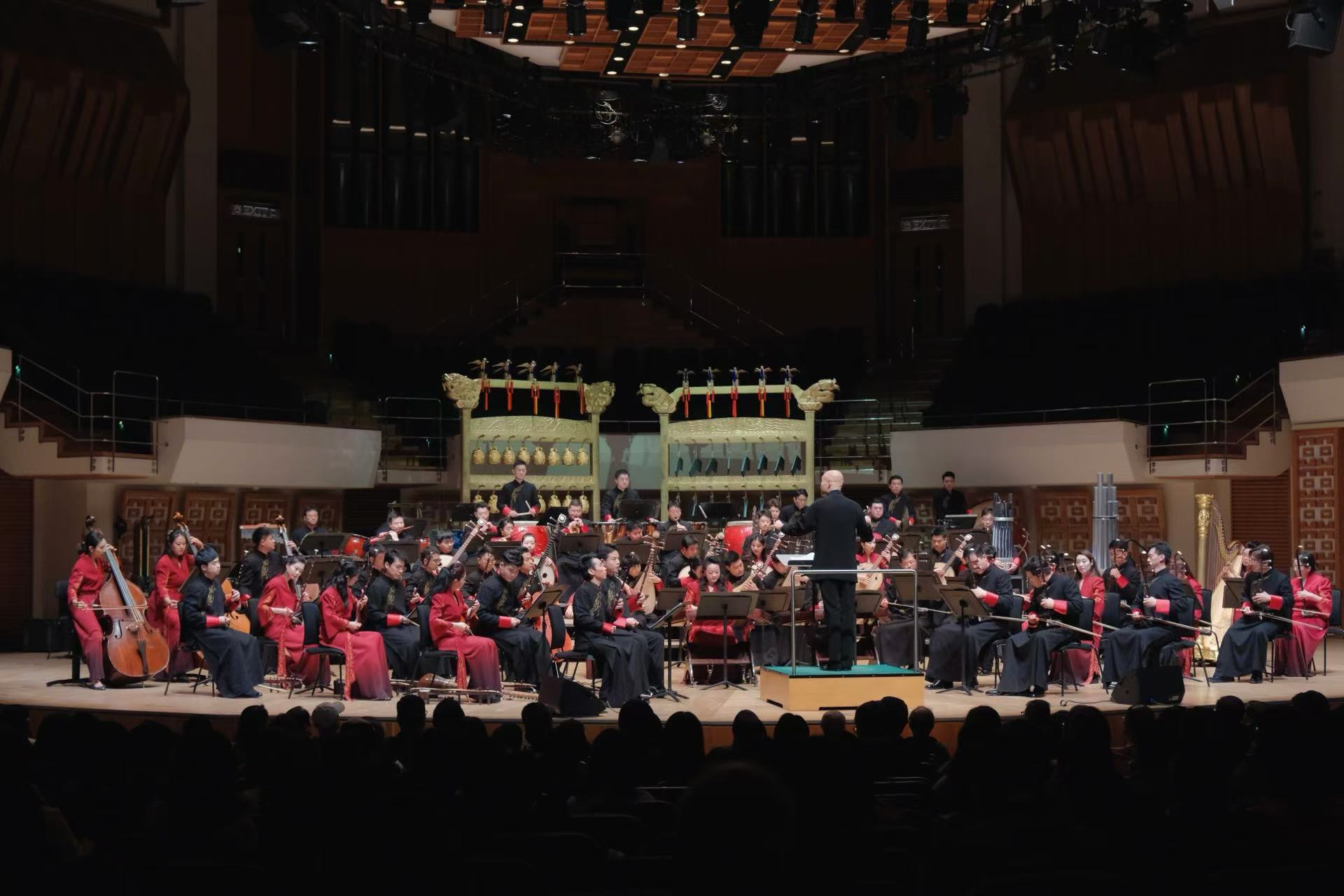 音樂會以凸顯儀式感的黃鐘.器樂合奏《頌》開篇,八音在演奏家的手中不僅再次發出源自古老華夏的悠然之音,也奏響當代中國的恢巨集之樂。青年古琴演奏家路寧緩緩撫琴,演奏帶着厚重歷史感的《知音》一曲,盡展古老樂器古琴的獨特魅力。琵琶三重奏《金戈鐵馬》由極具中國音樂代表性的經典曲目《十面埋伏》、《霸王卸甲》改編而成,打擊樂與琵琶的聲音交織,讓觀眾彷彿置身於激烈的戰鬥之中。大阮與吟誦《酒狂》據古曲改編,青年阮演奏家朱承梓化身瀟灑的古人,為觀眾帶來穿越時空的震撼。
