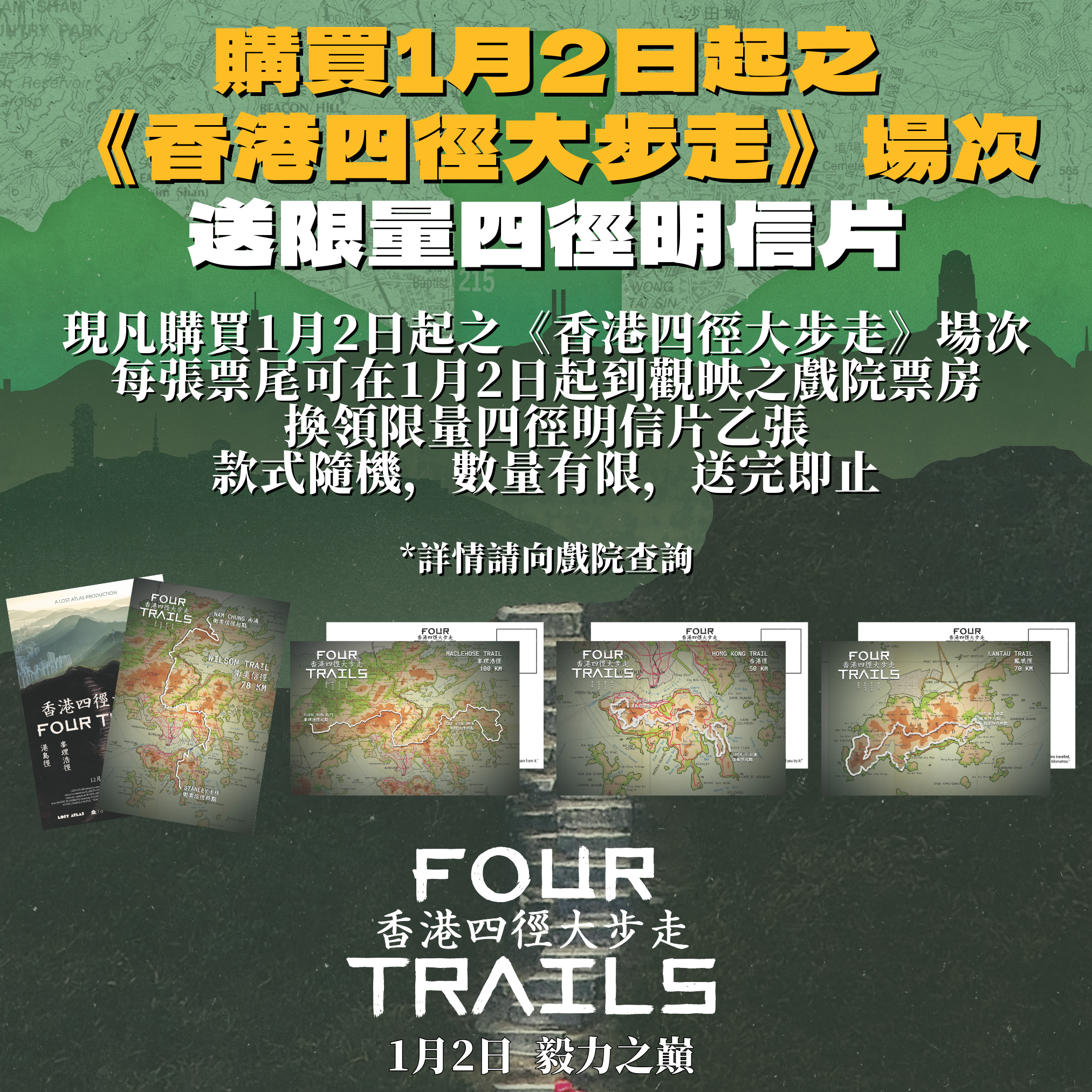 另外,為答謝觀眾的支持,現凡購買1月2日起之《香港四徑大步走》場次,每張票尾可在1月2日起,到觀映之戲院票房換領限量四徑明信片乙張。款式隨機,數量有限,送完即止。如想了解更多詳情可向戲院查詢。未入場觀看電影的朋友們記得密切期待!