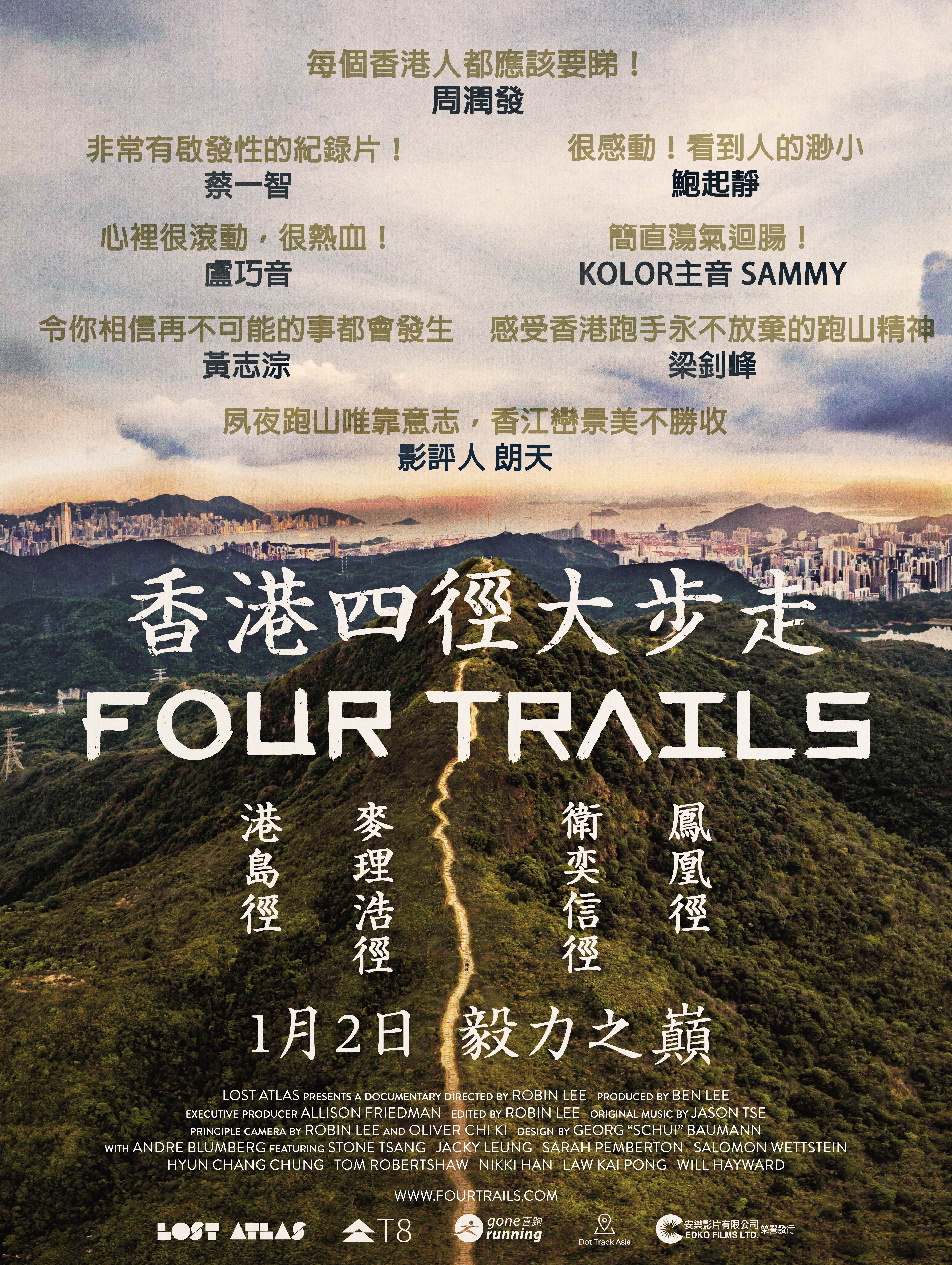 為滿足於限定放映時無法買到戲票入場觀看《香港四徑大步走》的觀眾,電影現於1月2日正式上映,加開更多放映場次,希望能讓更多觀眾入場欣賞。這部電影製作過程長達3年,其意義不只是去紀錄各跑手的故事,亦是導演Robin送給香港的一封情書。這次電影能正式上映,導演更特別剪輯了最新航拍預告,除了看到跑手在香港山徑間的堅持,更能以航拍鏡頭俯瞰神級四徑於不同時間及天氣下的美景,其壯麗程度絕對能媲美不少外國著名山嶺!