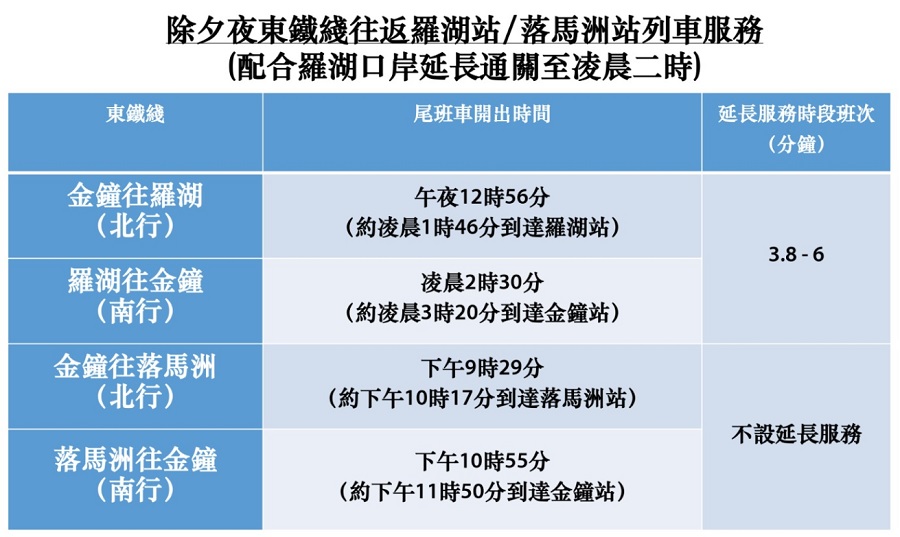 【橙訊】港鐵今日宣布,為配合羅湖口岸在除夕夜延長通關至凌晨2時,當晚港鐵東鐵線由金鐘開往羅湖方向的尾班車,將在凌晨12時56分開出,並於約凌晨1時46分到達羅湖站,即口岸關閉前約14分鐘。而當晚由羅湖站開往金鐘站的尾班車,會在凌晨2時30分,即口岸關閉後約半小時開出。