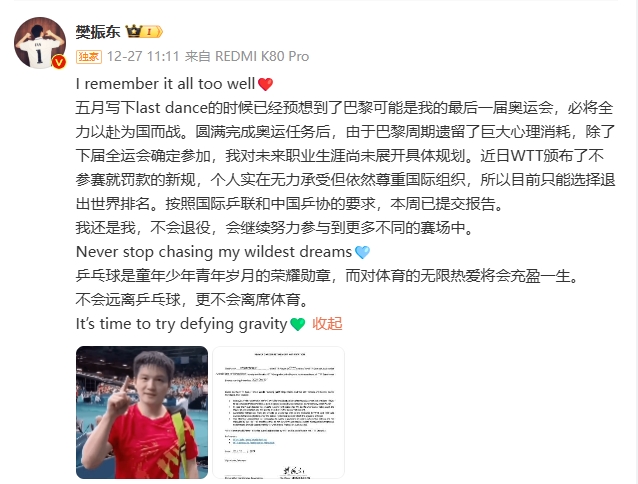 樊振東宣布退出世界排名。