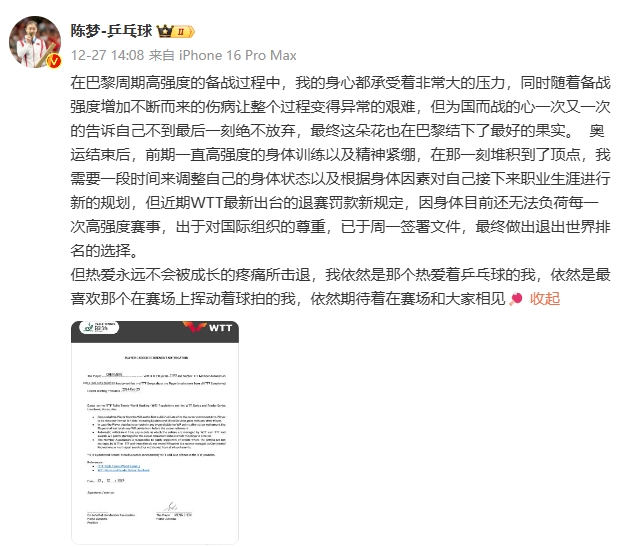 陳夢宣布退出世界排名。