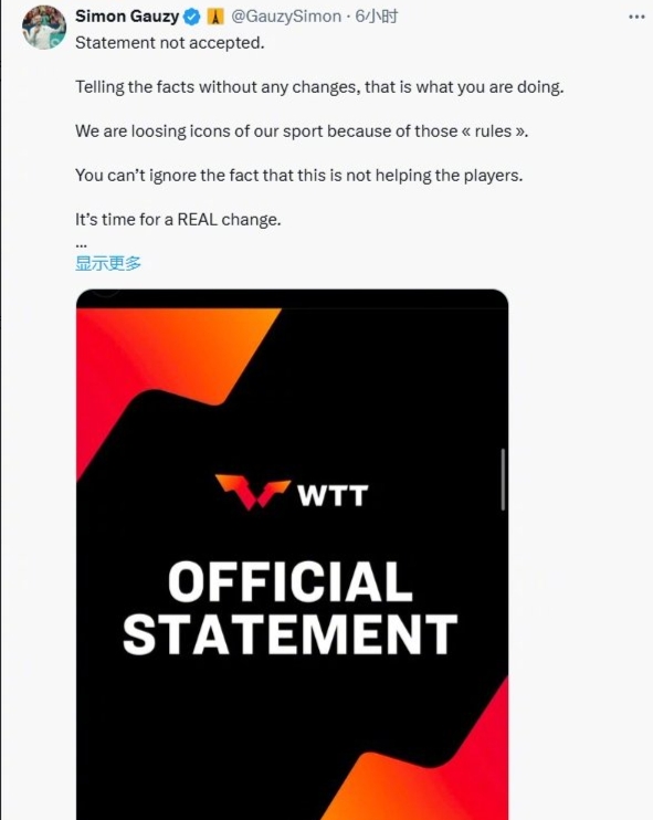 不過,對於WTT的回應,乒乓球員們並不買賬,法國的西蒙-高茨、勒布倫兄弟都表示不接受聲明。西蒙-高茨表示,因為這些規則,大家正在失去這項運動的偶像。WTT不能忽視這對球員沒有幫助的事實。現在是進行真正改變的時候了。