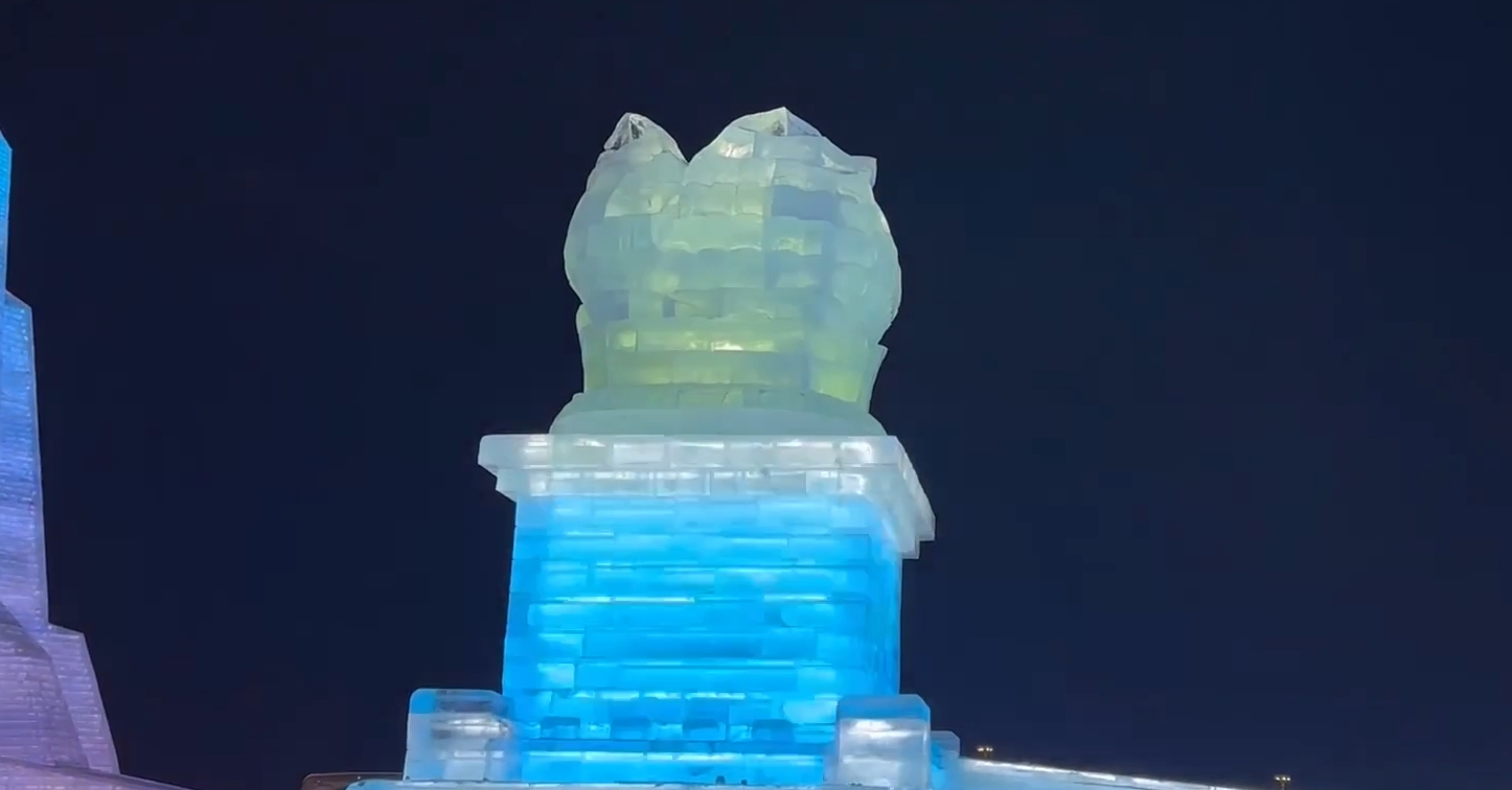 夜幕降臨,哈爾濱冰雪大世界變身琉璃世界。燈光流轉,美麗的「金紫荊」在夜空中栩栩如生。香港遊客黃先生拿出手機拍下這朵冰紫荊,發送給遠在香港的父母。他表示,金紫荊銅像位於香港會議展覽中心,遠在數千裏之外,冰雕師的精湛技藝讓這朵紫荊花再次盛放,象徵着香港永遠繁榮昌盛。
