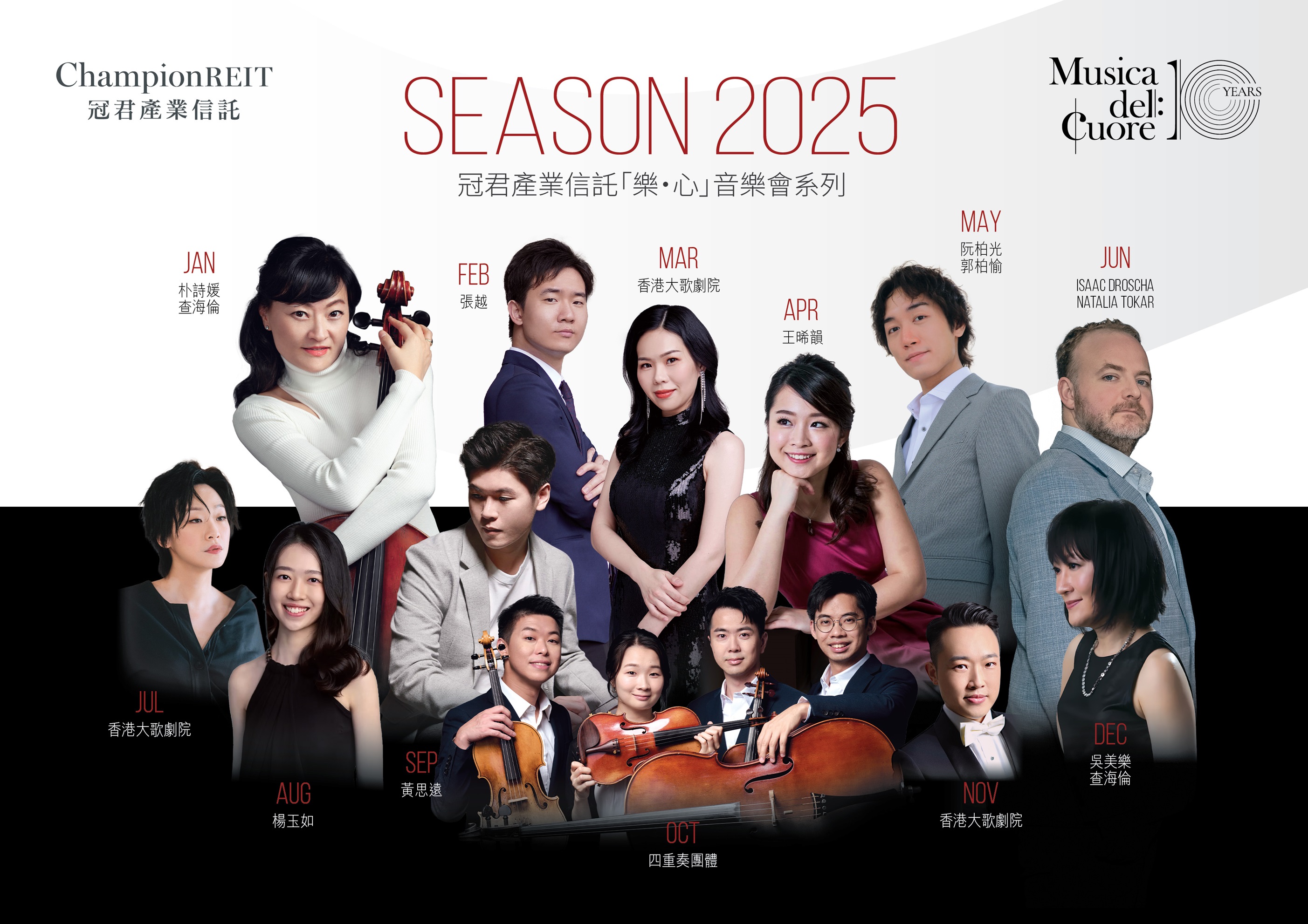 2025年,「樂.心」將在不同月份的音樂會裡,匯聚已建立名聲的音樂人及新世代矚目音樂人,令他們展現各自的個性。當中年輕一代各有天賦的出色樂手,包括:榮獲2019年Chautauqua鋼琴比賽冠軍的鋼琴家張越、專輯獲法國國家廣播電台好評的鋼琴家王晞韻、贏得亞洲蕭邦國際鋼琴比賽的鋼琴家黃思遠、於英國皇家音樂學院深造的鋼琴家楊玉如,及師從Lorenzo Iosco,並於曾兩度於法國Prades音樂節中表演的單簧管演奏家阮柏光,還有奪得2021年蕭邦大道國際鋼琴比賽專業組冠軍及最佳蕭邦作品演繹獎的鋼琴家郭柏愉。特別一提的是香港唯一的全職弦樂四重奏Cong Quartet,他們曾獲2022年意大利Virtuoso & Belcanto室內樂比賽冠軍及曾任香港中文大學駐團藝術家。