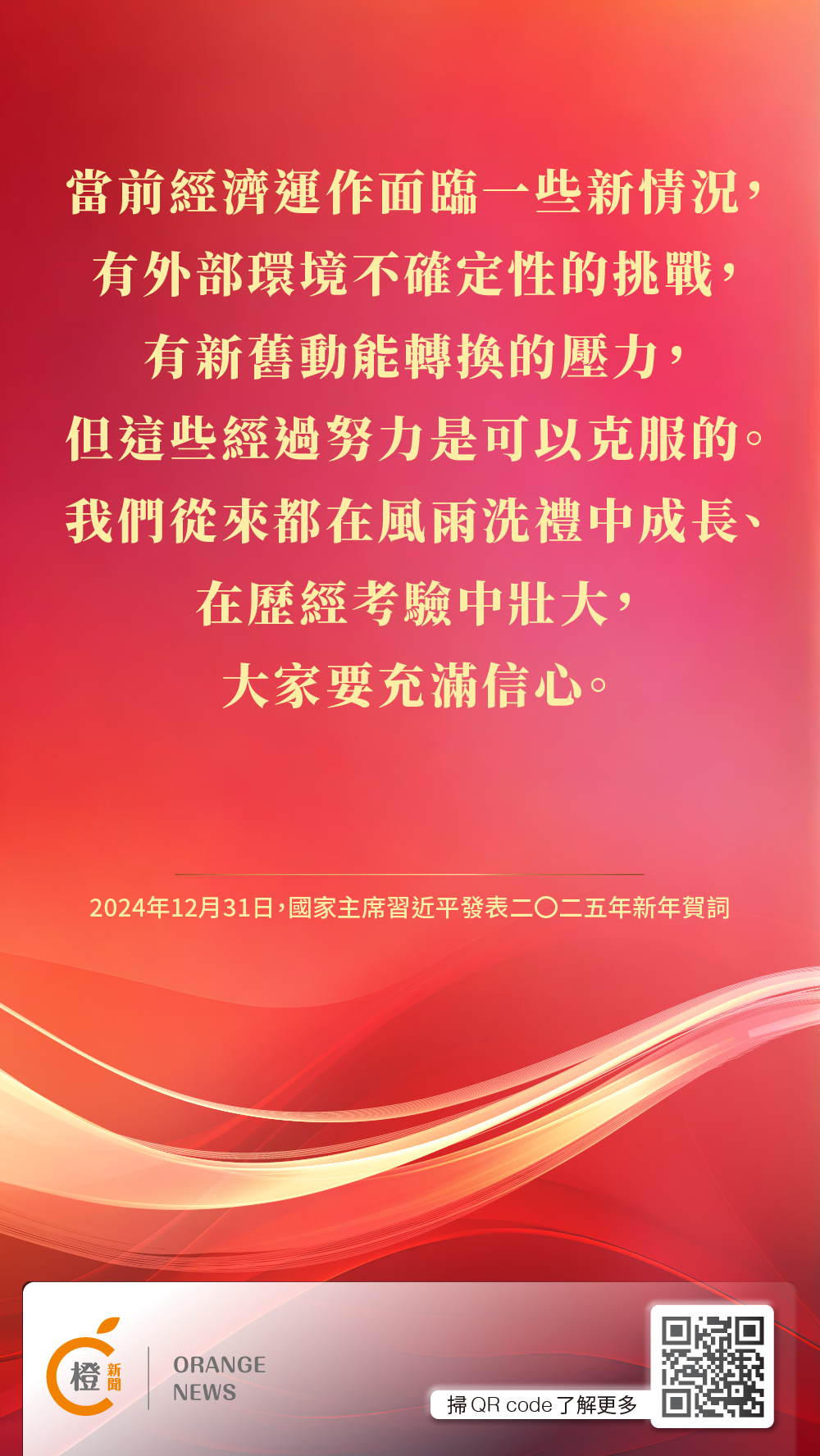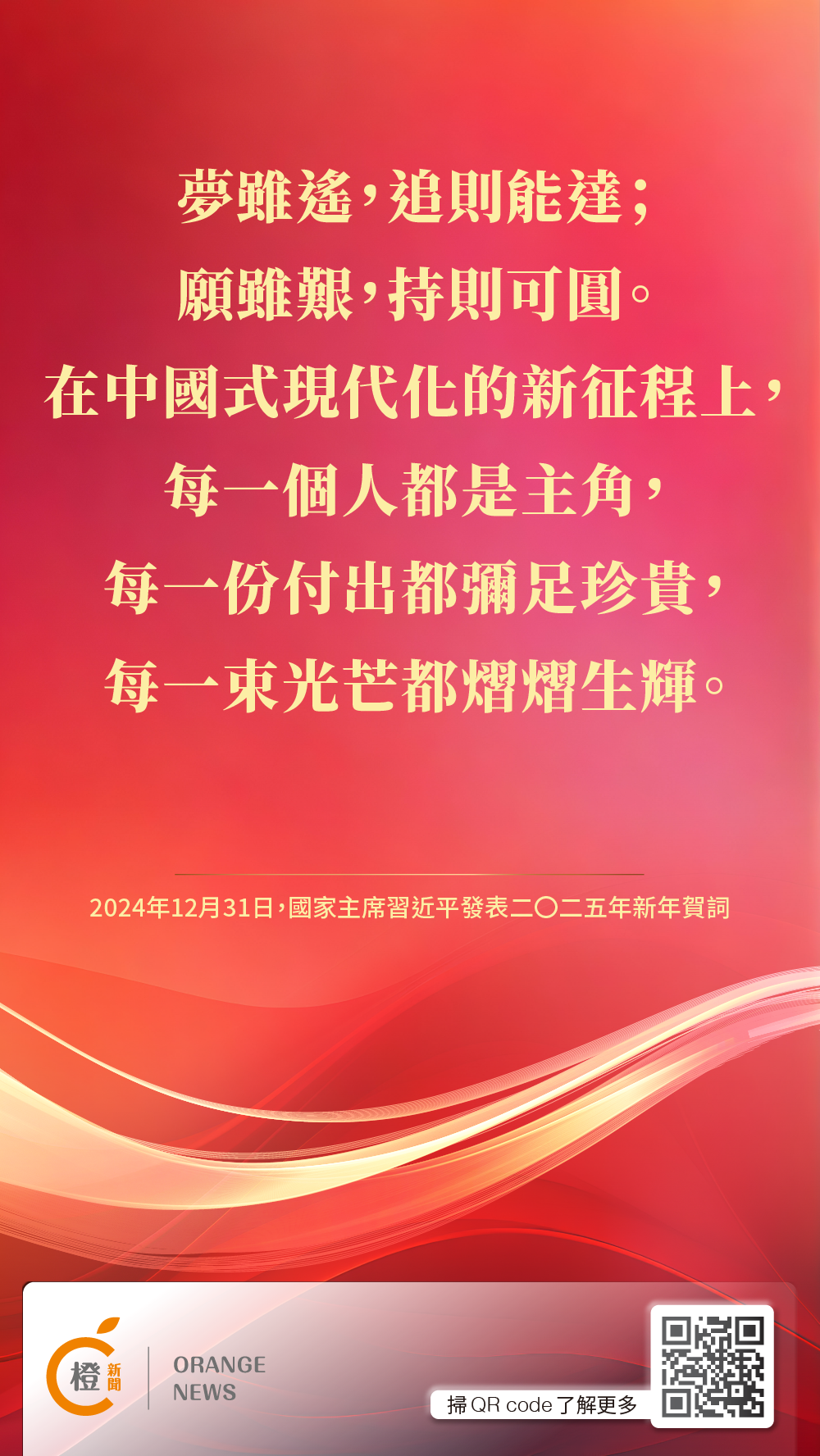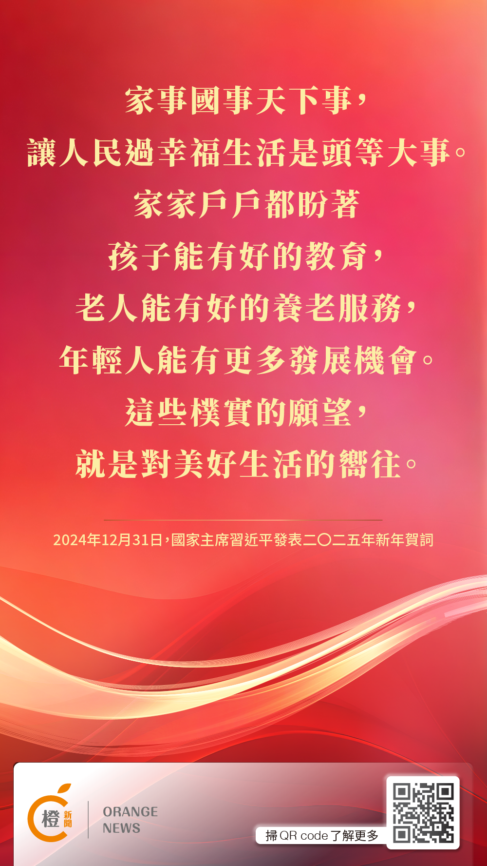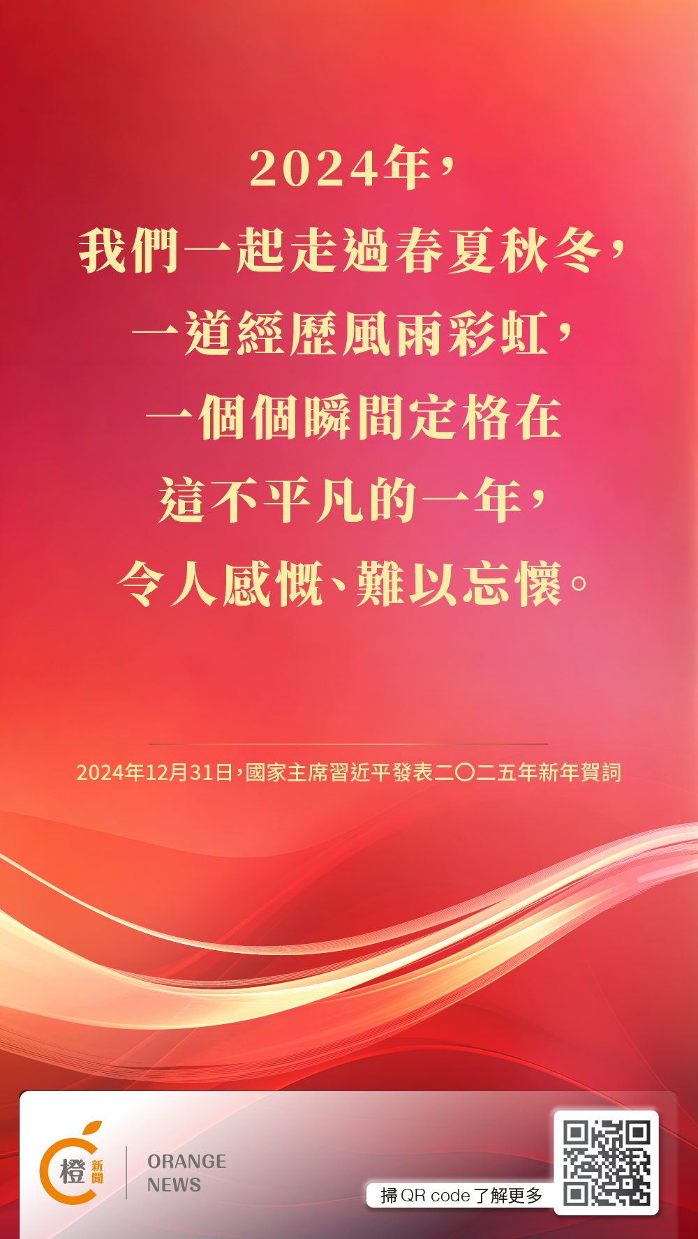 【橙訊】2024年12月31日,新年前夕,國家主席習近平透過中央廣播電視總台和互聯網,發表了2025年新年賀詞。《橙新聞》在此摘錄習主席賀詞金句,與讀者分享。