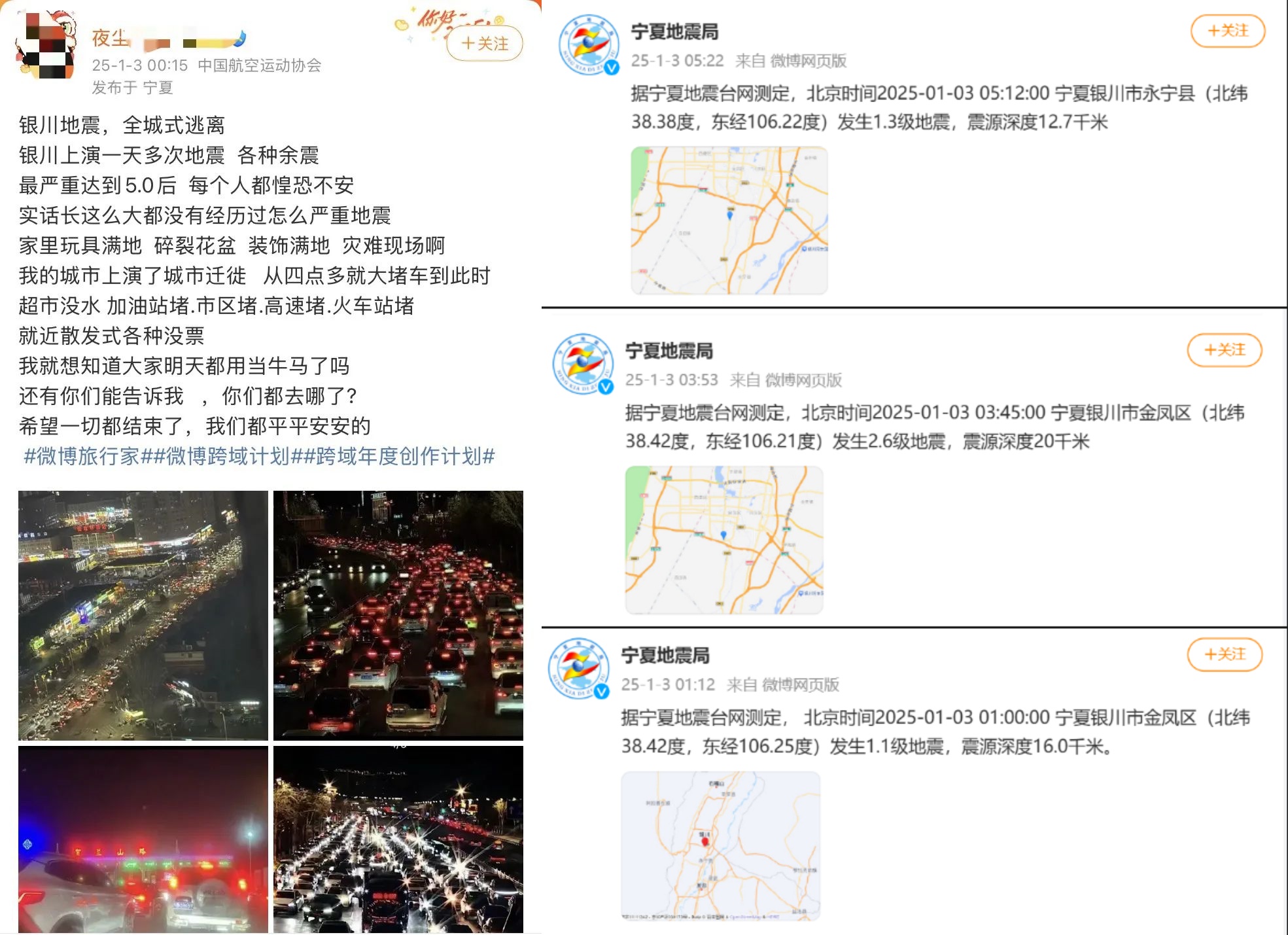 銀川市民普遍感受到強烈震感,許多人驚慌失措,跑到戶外避難。有報道稱,寒冬中有人僅着單衣便逃離家中。據寧夏地震局初步判斷,2日永寧縣4.8級地震的原震區及附近地區近日可能再次發生4至5級地震。這一預報加劇了市民的不安,許多人選擇即刻駕車或乘高鐵離開銀川。社媒中的相關影片顯示,銀川各個出城路段都已擁堵不堪,火車站也是水泄不通。