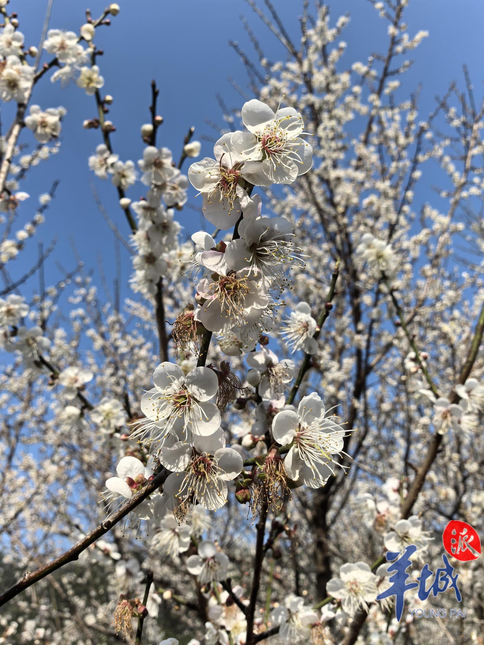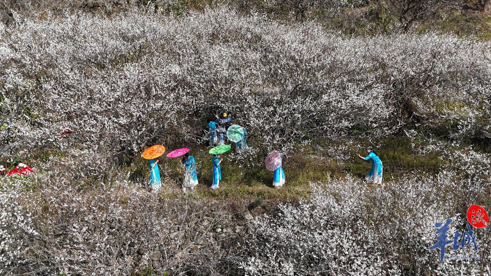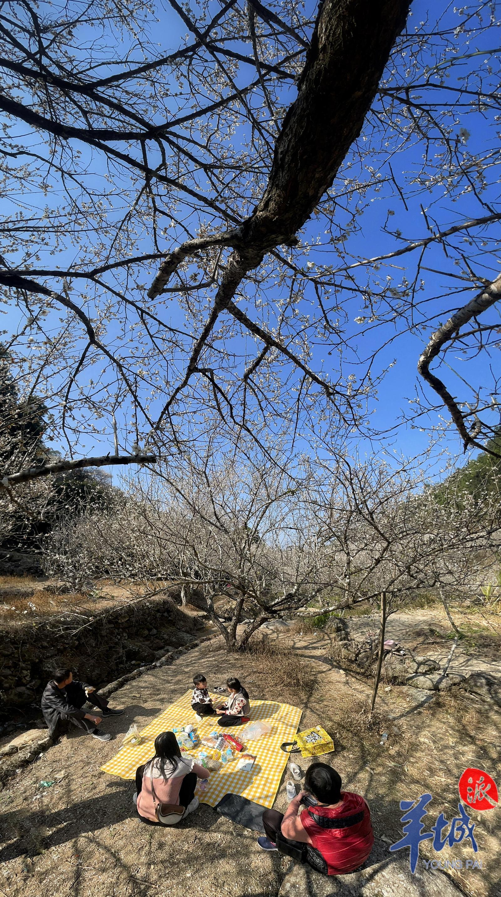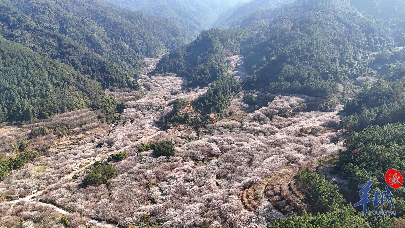 上盆山的青梅有成片種植的,也有沿着溪流和山坡種植的,更有在農舍前後栽種的。數百畝青梅分布於丘陵山谷和梯田中,迎寒而放,層層疊疊,美不勝收。花開時節,漫山遍野、林舍掩映,起伏有致。溪流和村莊所在,都變成漫山花海。晨光裡、夕陽下、山霧中,陽光與霧氣相輝映,舉目之下,飛雪連天,清香入懷,如入仙境。妙的是溪流與村莊的相遇,更讓這片花地有了別樣的意趣。而因為這花海盛放,小蜜蜂也紛紛飛來湊個熱鬧,嚶嚶採蜜。