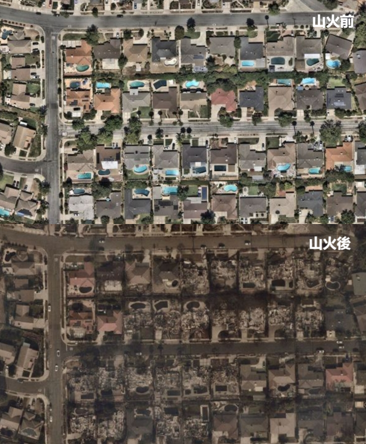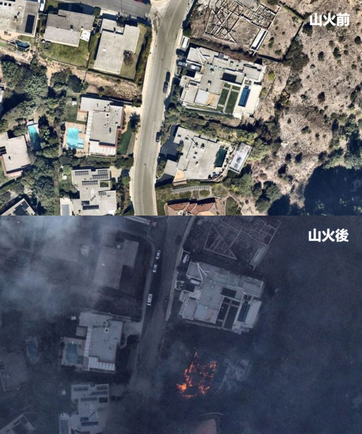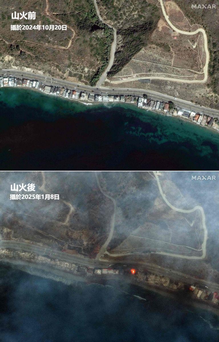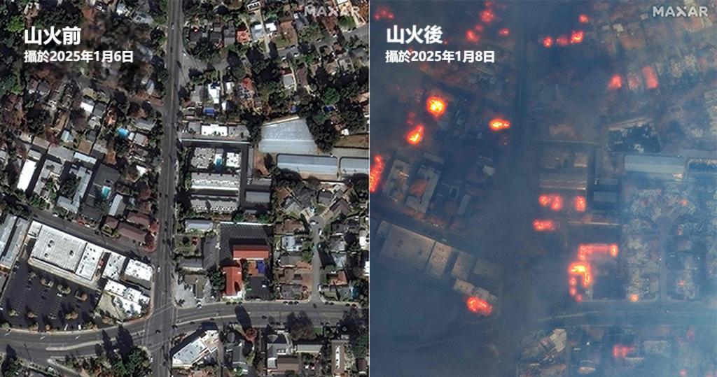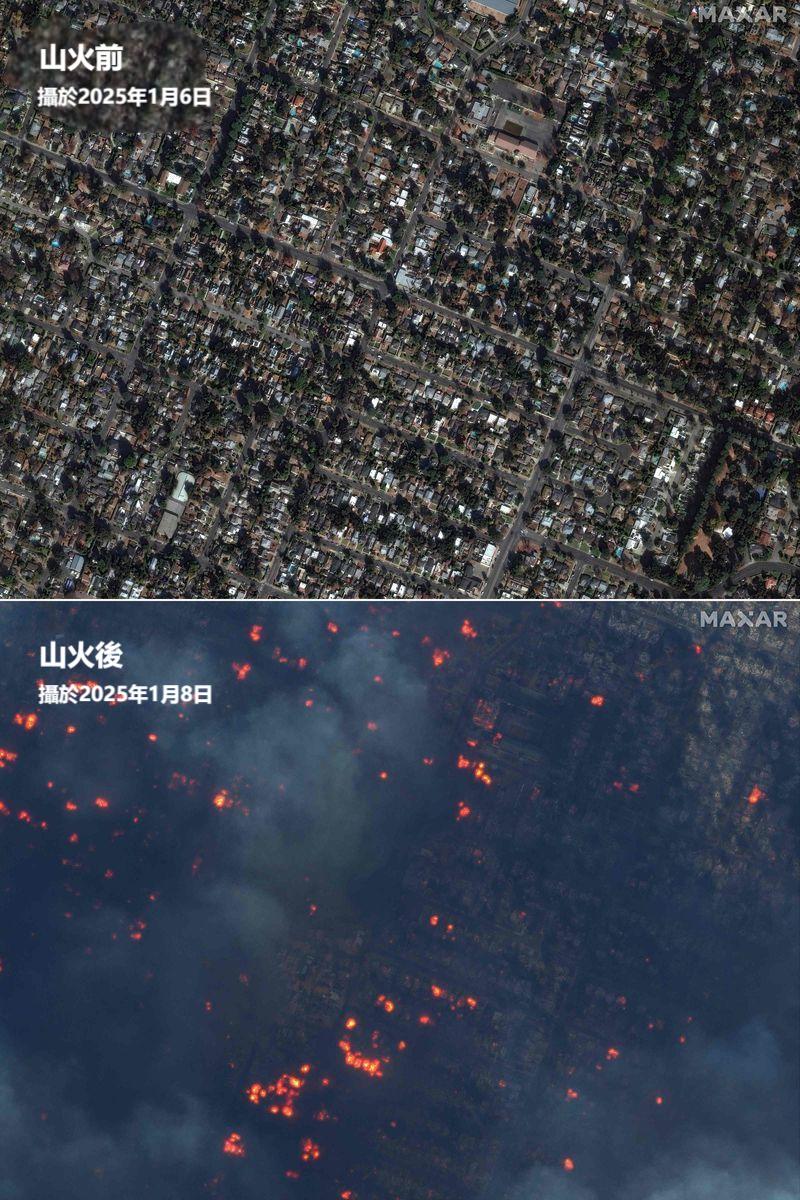 【橙訊】美國洛杉磯山火自當地時間周二(7日)發生,火乘風勢下火場持續擴大。法新社公開衛星對比圖,對比拍攝於山火發生前後的圖像,可以看到山火對當地的社區造成了嚴重破壞,大量房屋被燒毀,從高空看是處處有火星。