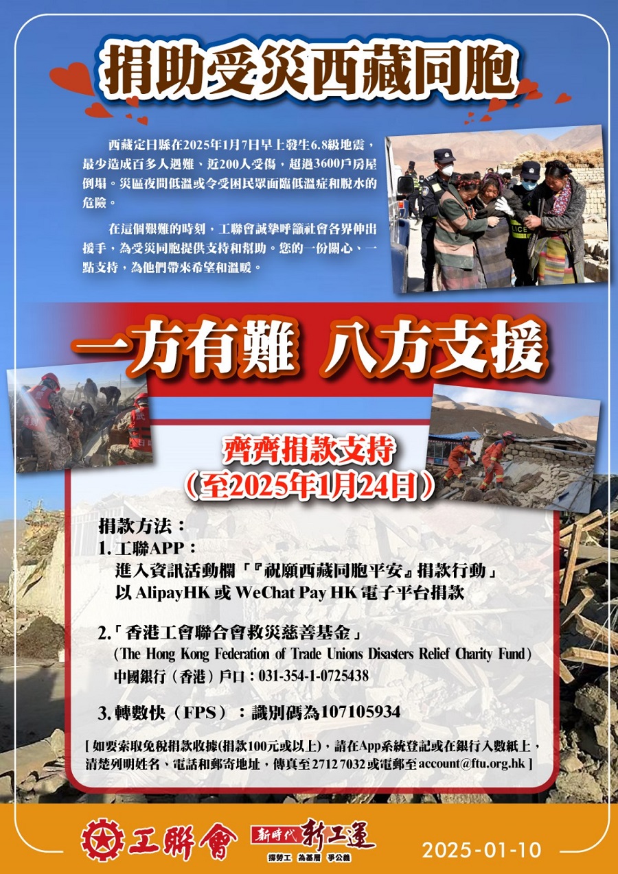 工聯會表示,西藏自治區定日縣於1月7日上午9時5分發生6.8級地震。最少造成百多人遇難,近200人受傷,搜救出407名被困人員,超過3600戶房屋倒塌,監測到餘震646次,最大餘震4.4級。災區夜間低溫或令受困民眾面臨低溫症和脫水的危險。