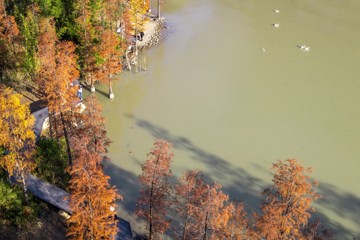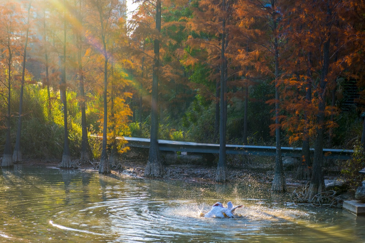 從洪湖公園東側門進入,往左步行約10分鐘就能收獲一大片落羽杉,走在當中的林間小路上,金紅的葉子,温柔的陽光,是繁忙都市生活中難得的「浮生半日閒」。