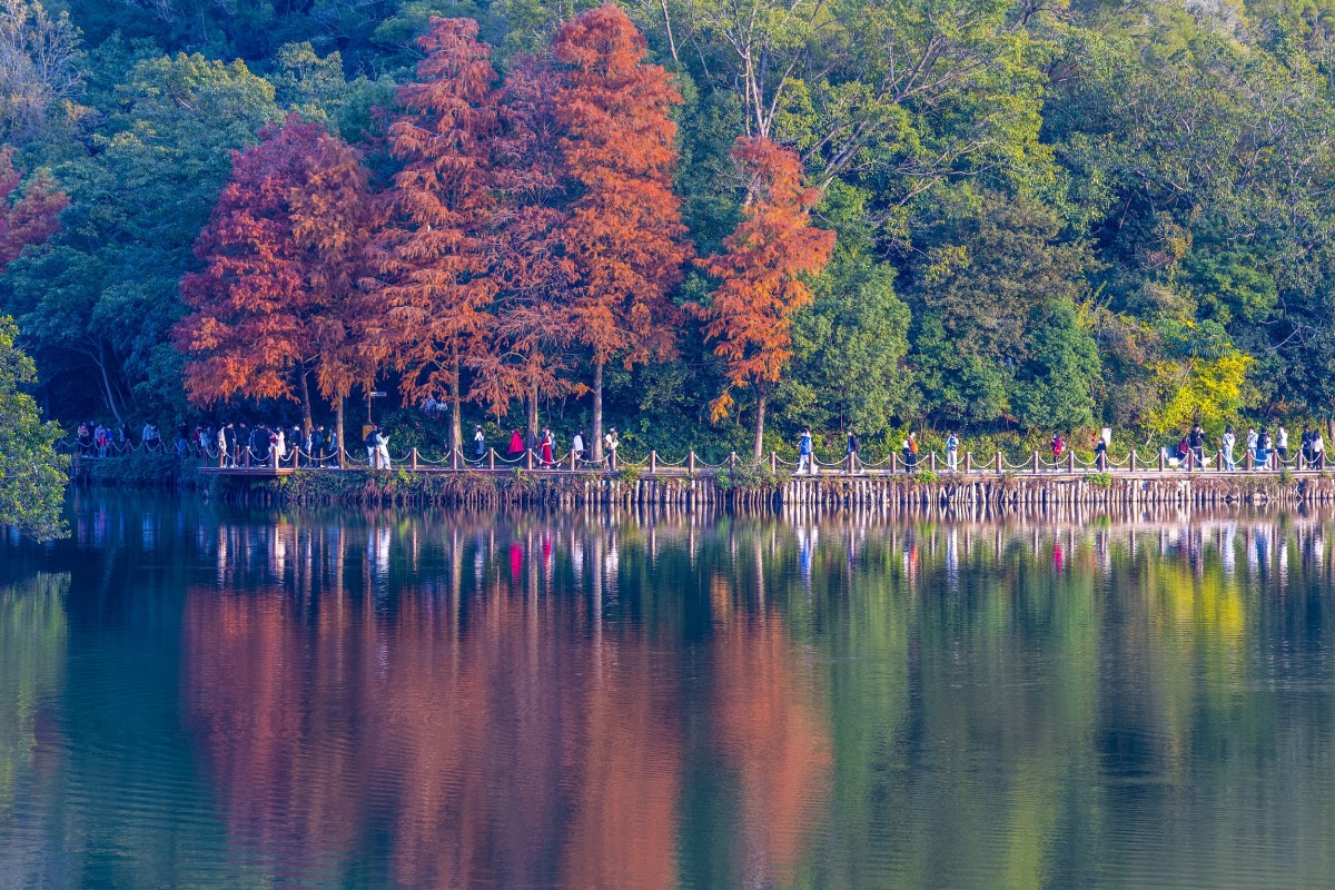 踏入12月,深圳仙湖植物園的落羽杉紅了,在水生園,大片大片焦糖色系的落羽杉,與水中倒影構成一幅富有詩意的冬日美景。(圖片來源:視覺中國)