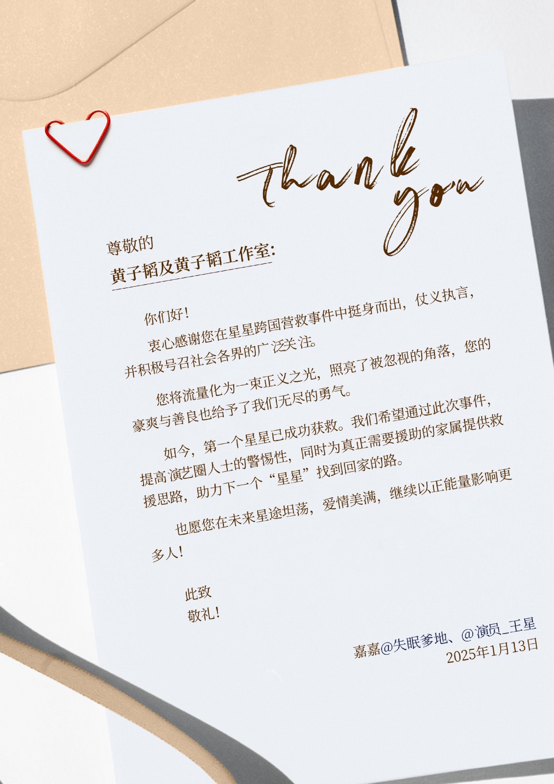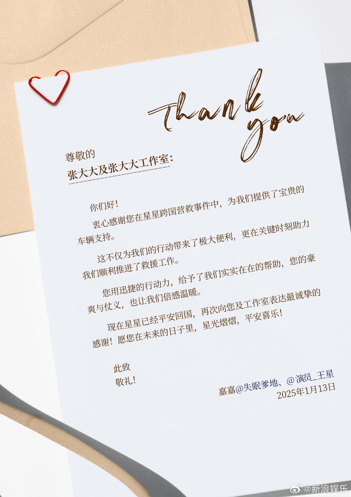 與此同時,王星和嘉嘉也給在第一時間幫助發聲的龔俊、黃子韜,提供車輛支持的張大大寫了感謝信。感謝他們在「星星跨國營救」事件中,第一時間挺身而出,正式因為他們的發聲及幫助,點燃了星星之火,為營救行動的順利推進提供了強勁動力與堅實後盾。